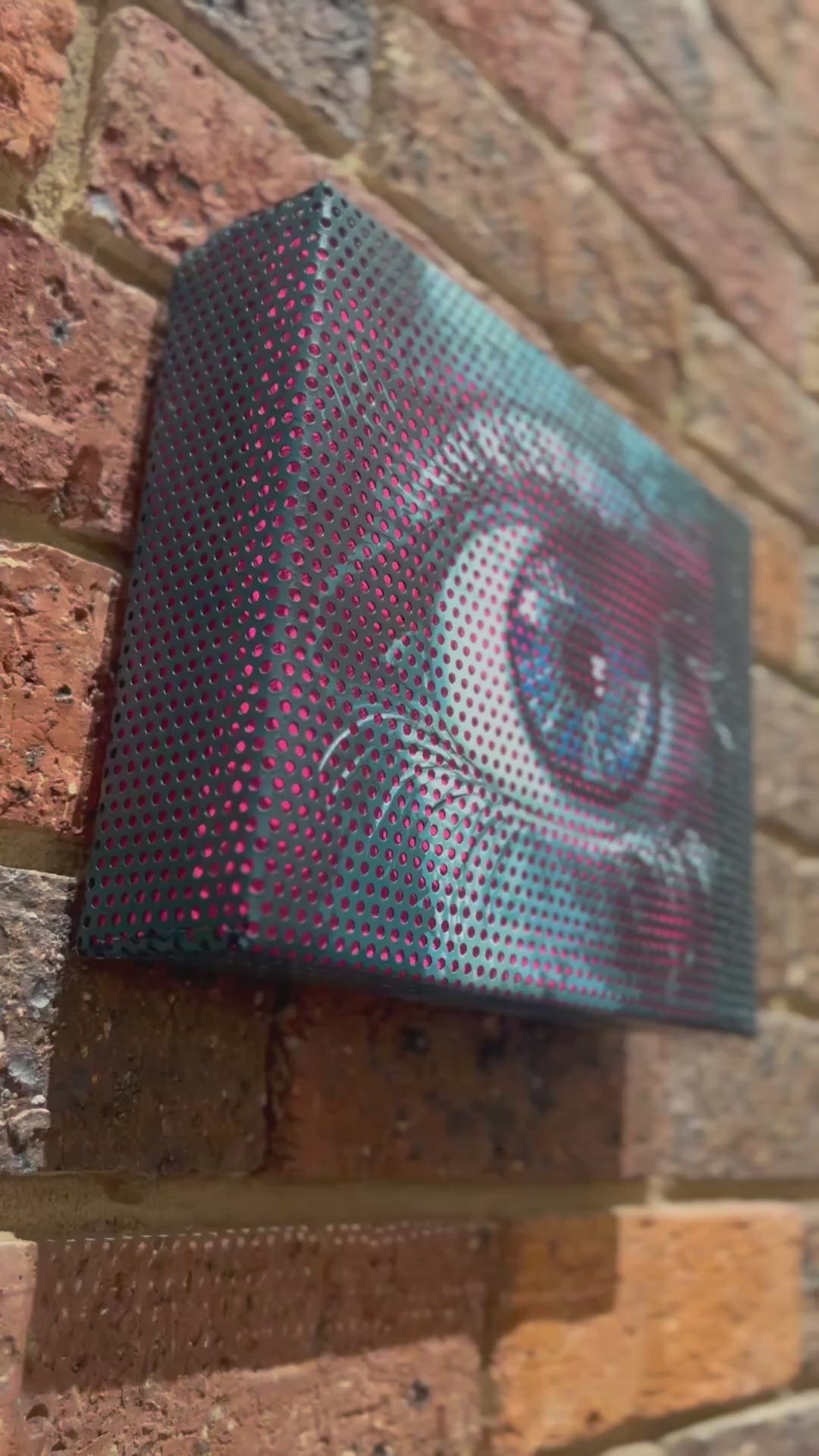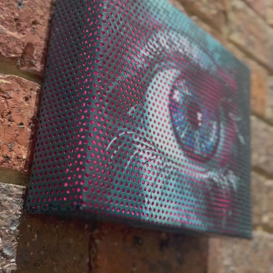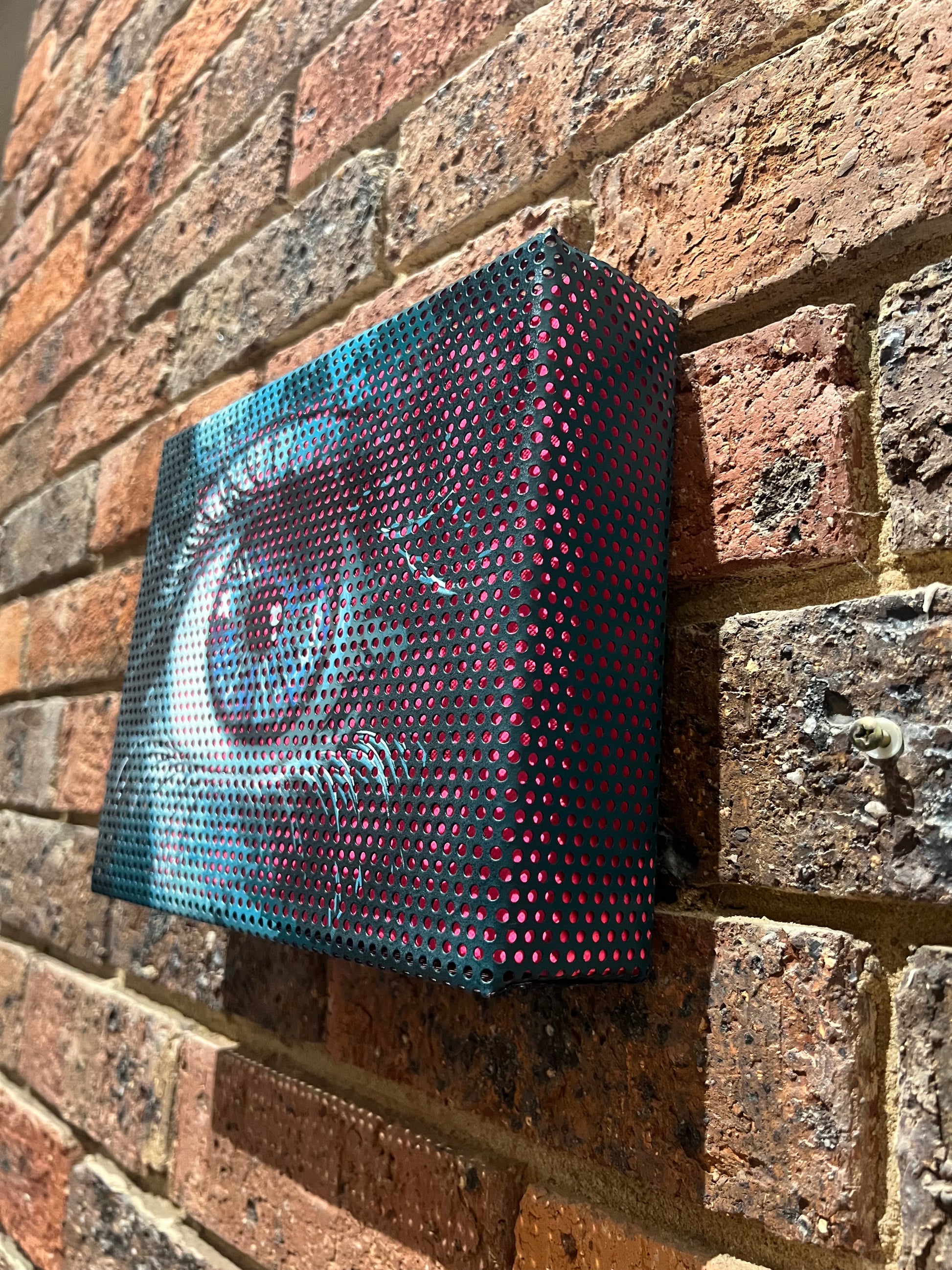 This new series uses my usual stencil technique, but this time the subjects are not inspired by memory or place - but are portraits created using AI - faces made from code. Using perforated steel as my "canvas", suspended over fluorescent backgrounds, each image plays with light and perception - asking: where does human identity end, and digital mimicry begin?