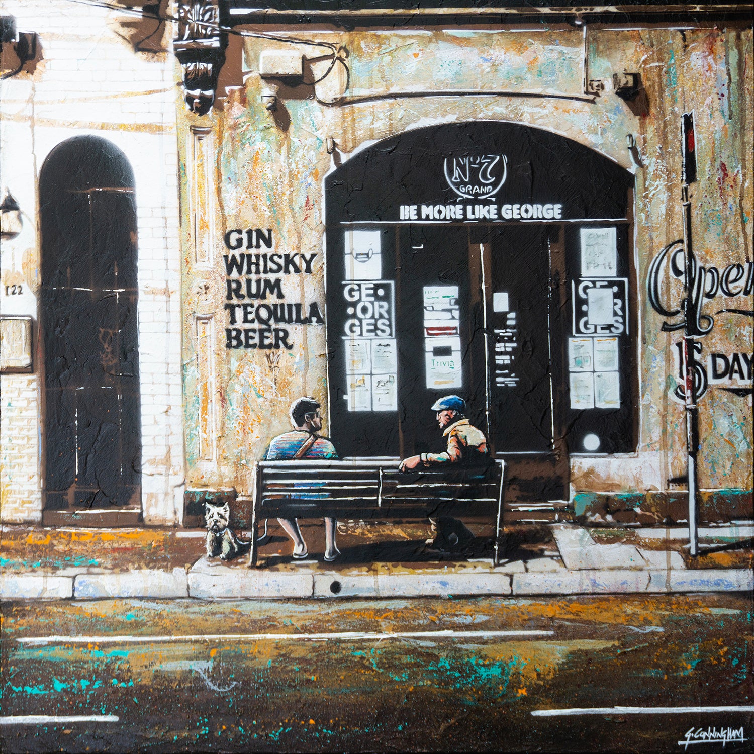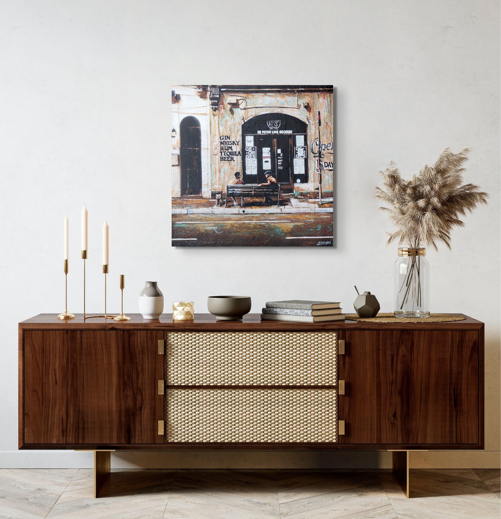Using a unique combination of impressionism and hand cut stencils, the background is multi-layered and textured to symbolise generations of history and also to create visual interest.