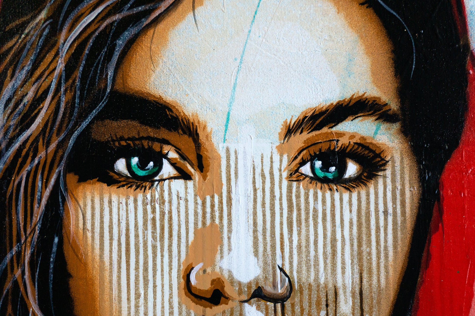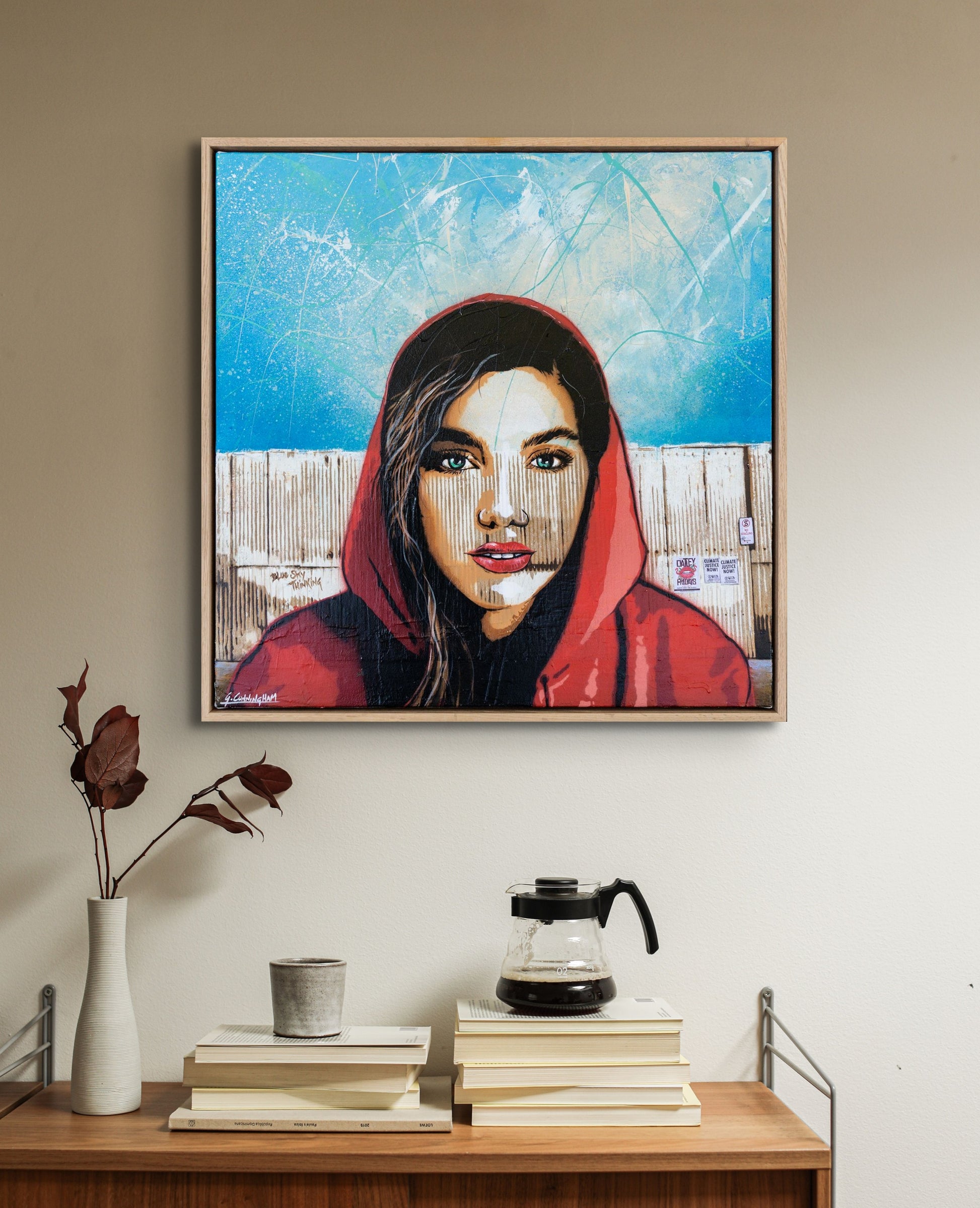 60 x 60cm (63 x 63 framed), Acrylic, aerosol & collage on canvas, this piece is framed in a natural oak floating frame.