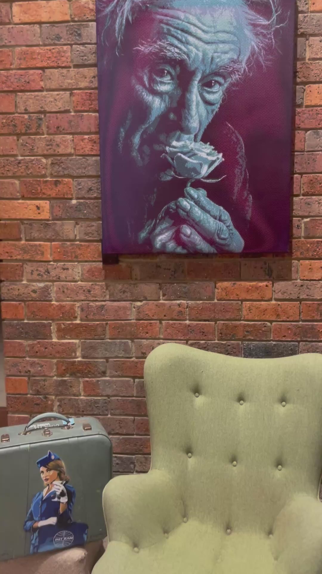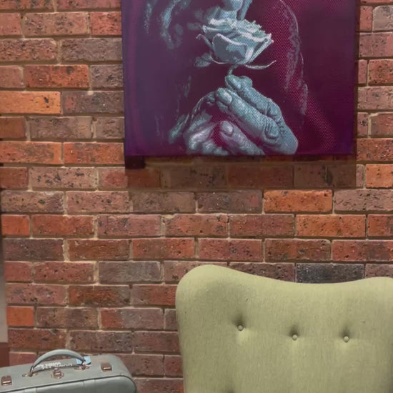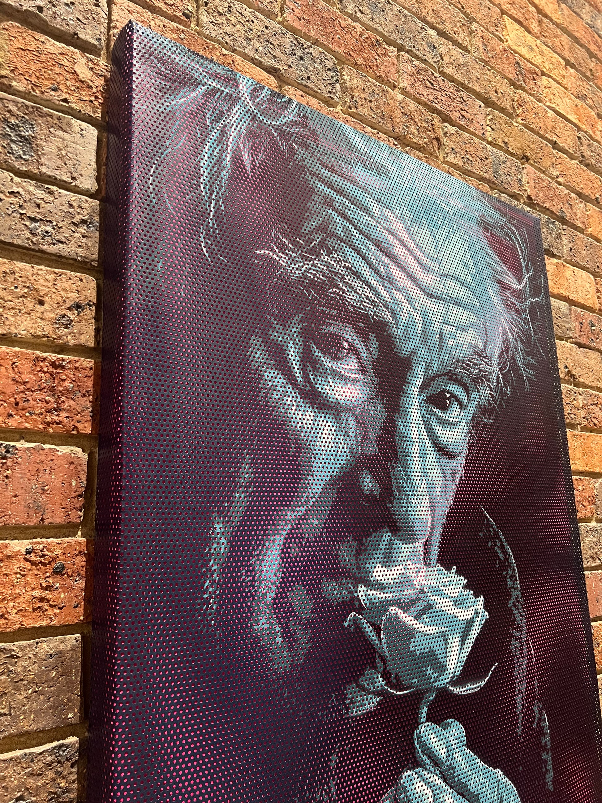 This new series uses my usual stencil technique, but this time the subjects are not inspired by memory or place - but are portraits created using AI - faces made from code. Using perforated steel as my "canvas", suspended over fluorescent backgrounds, each image plays with light and perception - asking: where does human identity end, and digital mimicry begin?