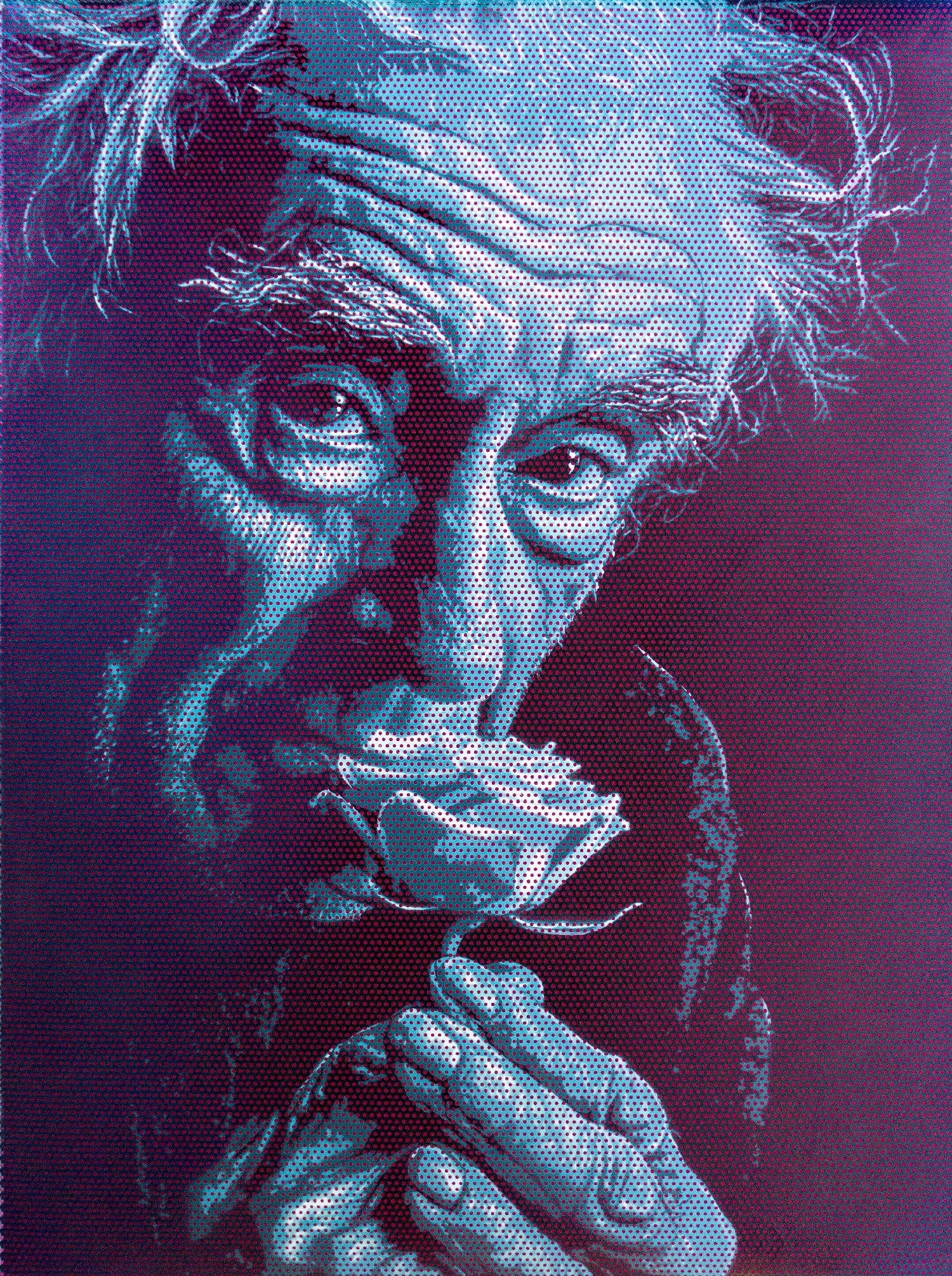 The holes in the steel represent pixels, the colours behind them blur and mix in the eye, not on the canvas. As the viewer shift their position, so too does the image - just like the line between the real and the virtual.