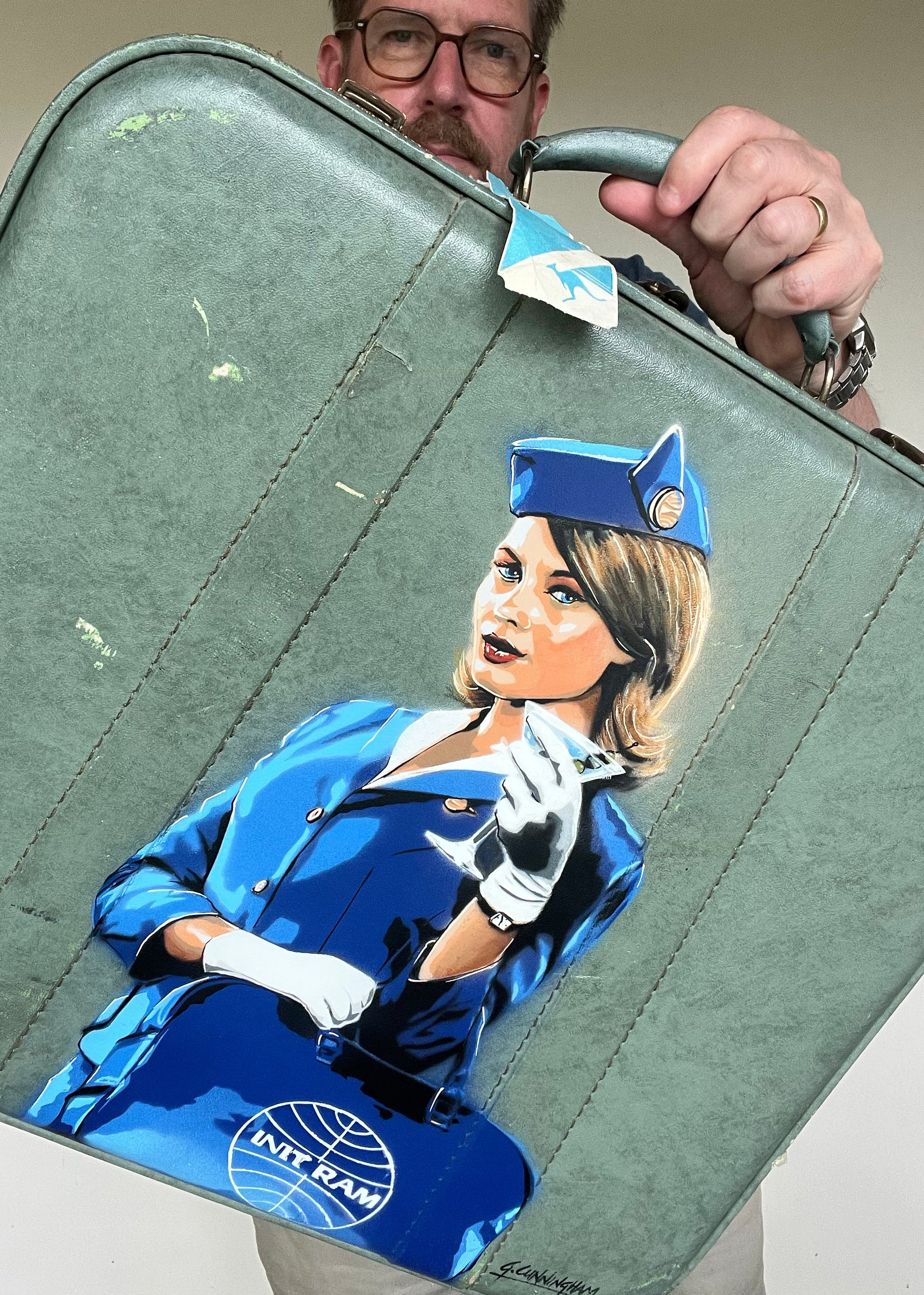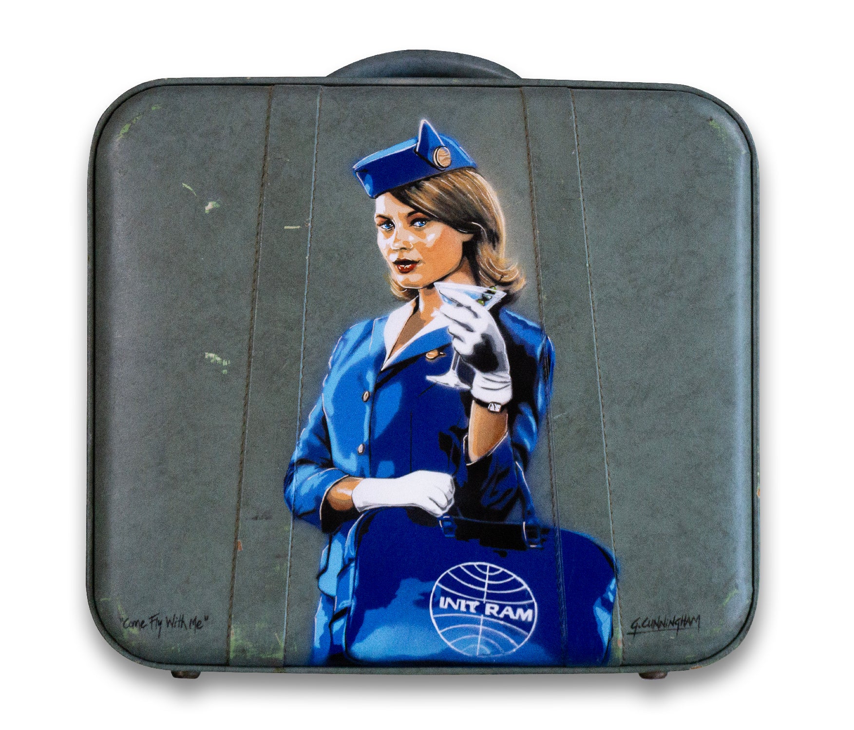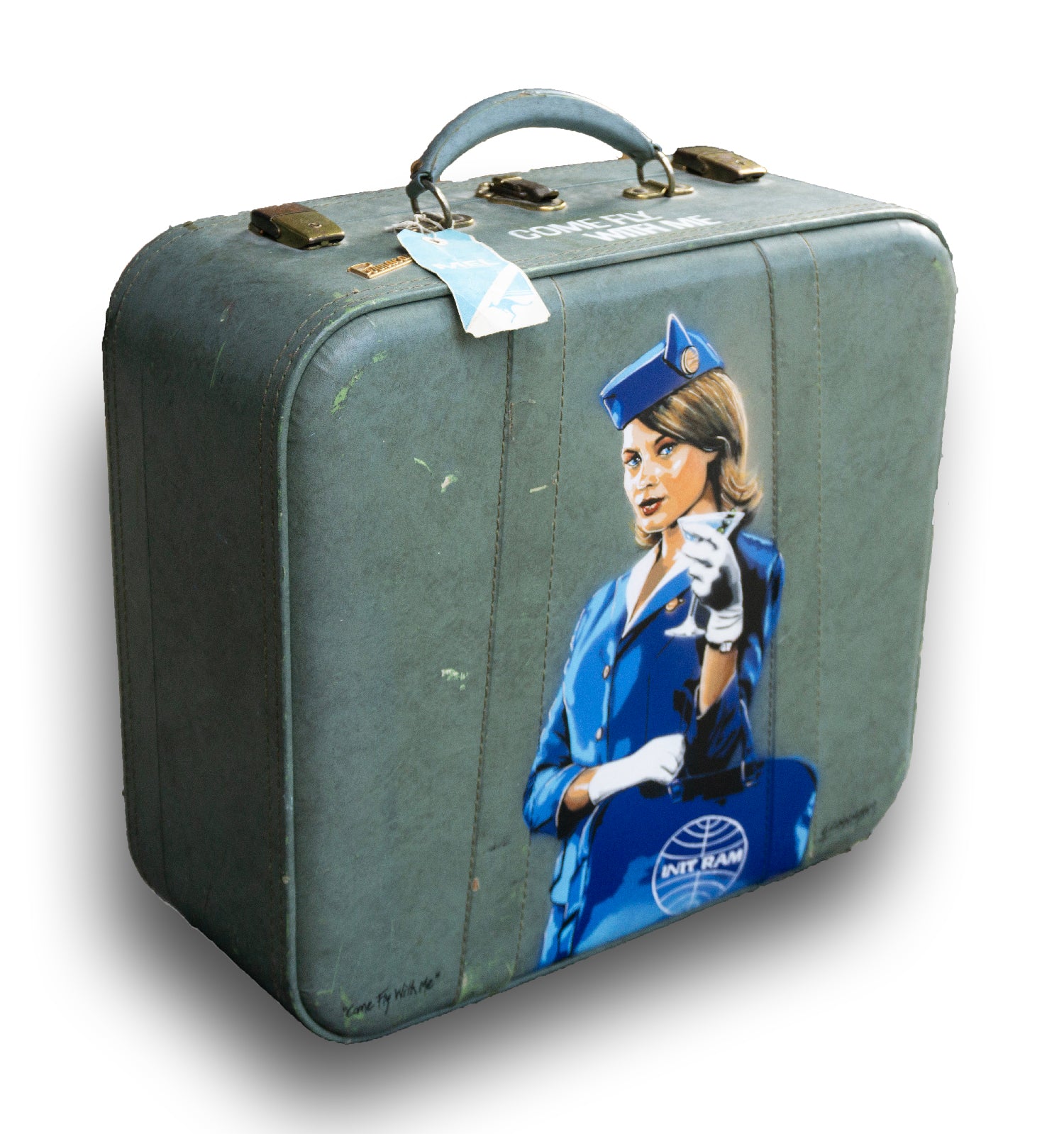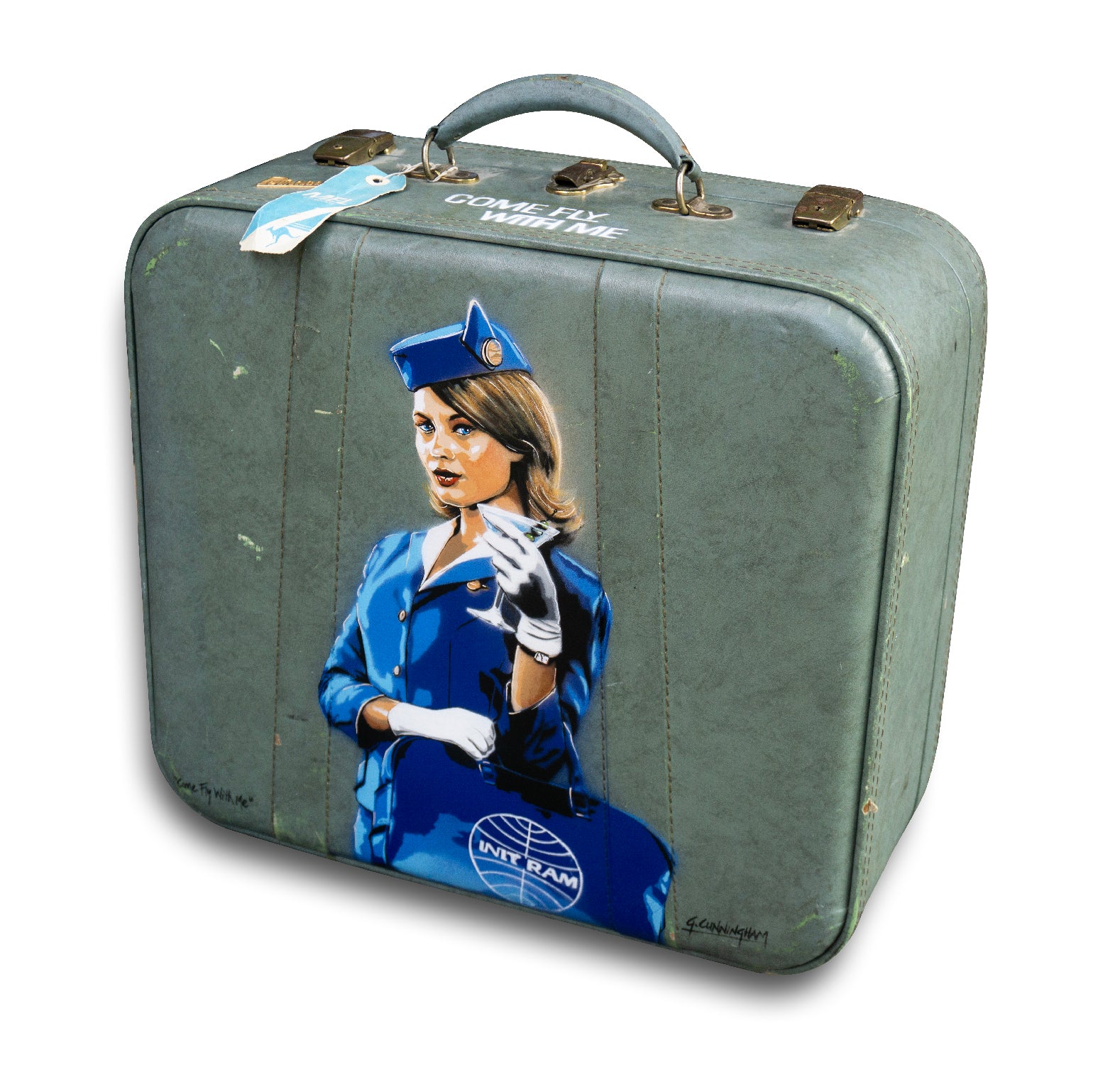 Acrylic & aerosol on a vintage suitcase. 43w x 48h x 23cm.