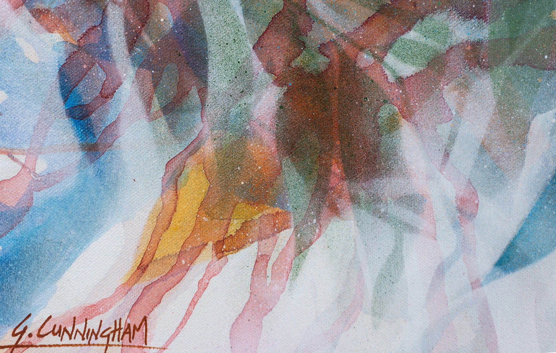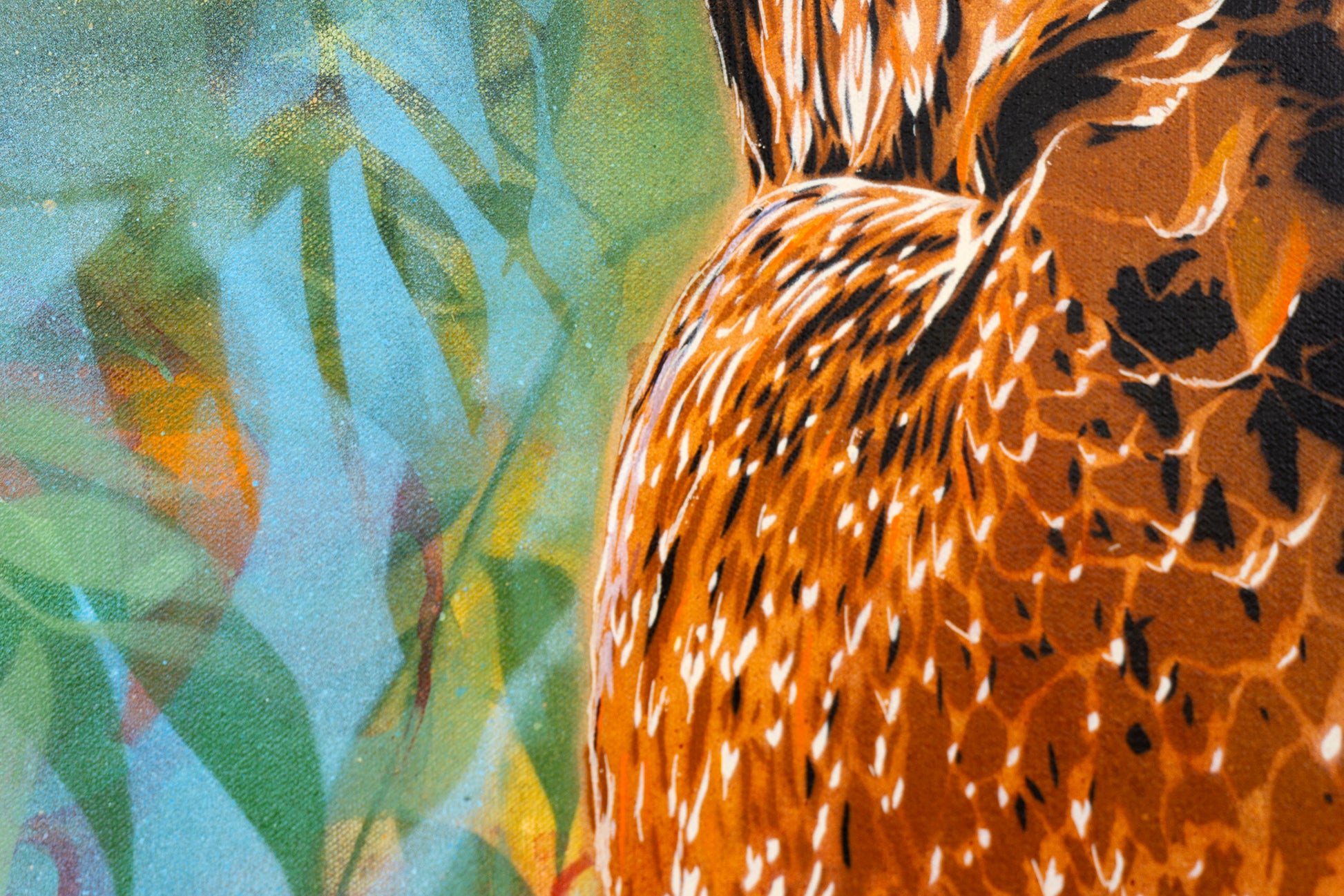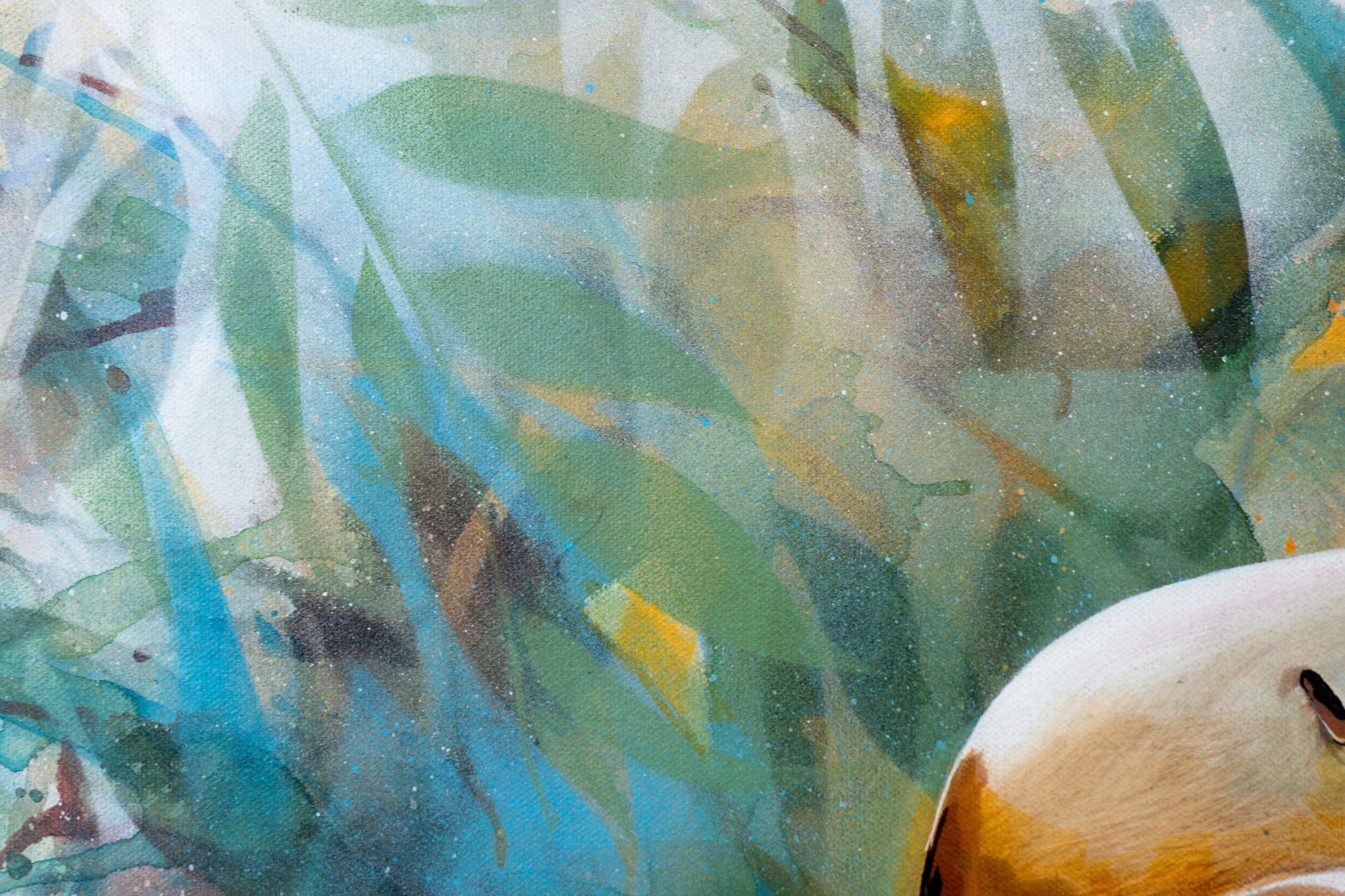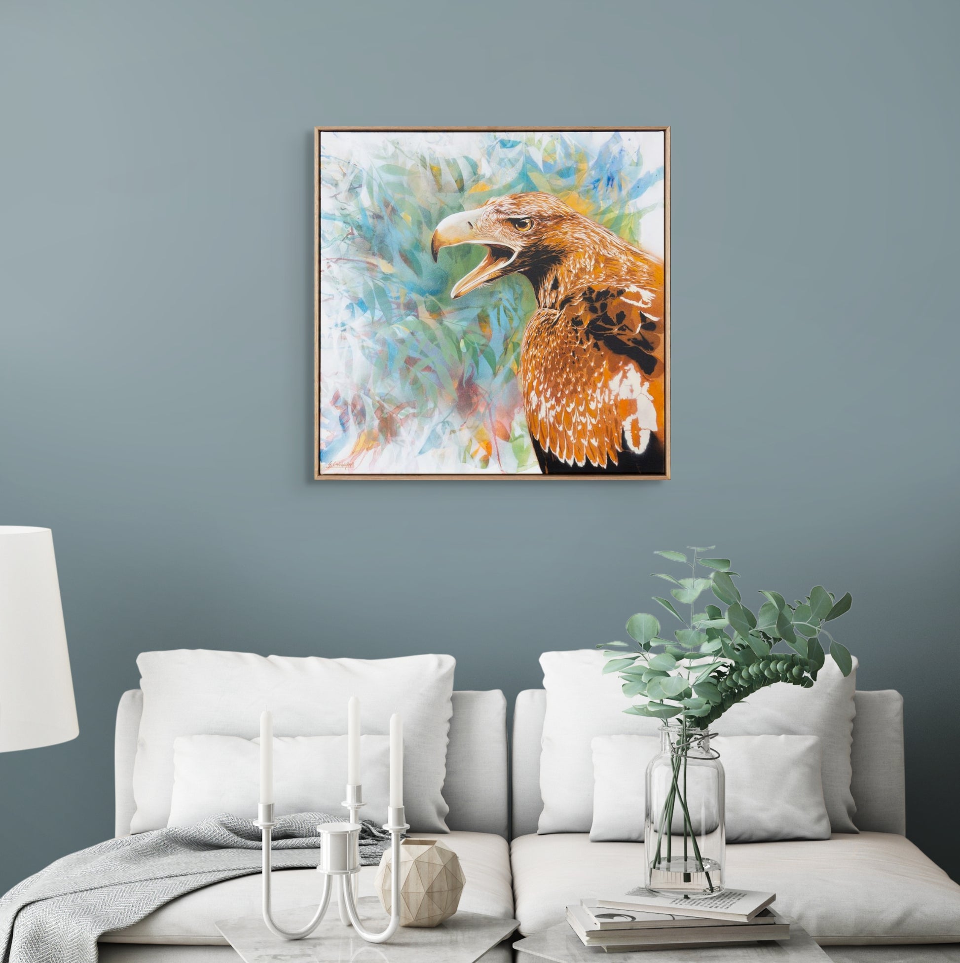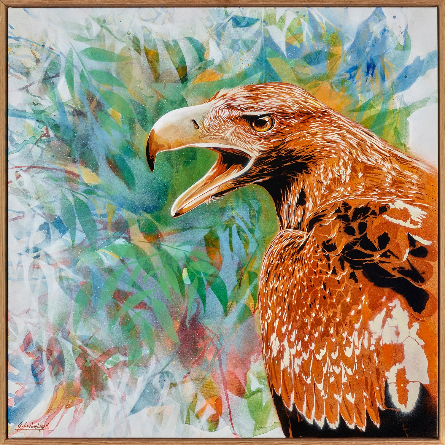 70 x 70cm (73 x 73 framed), Acrylic & aerosol on canvas, this piece is framed in a natural oak floating frame.