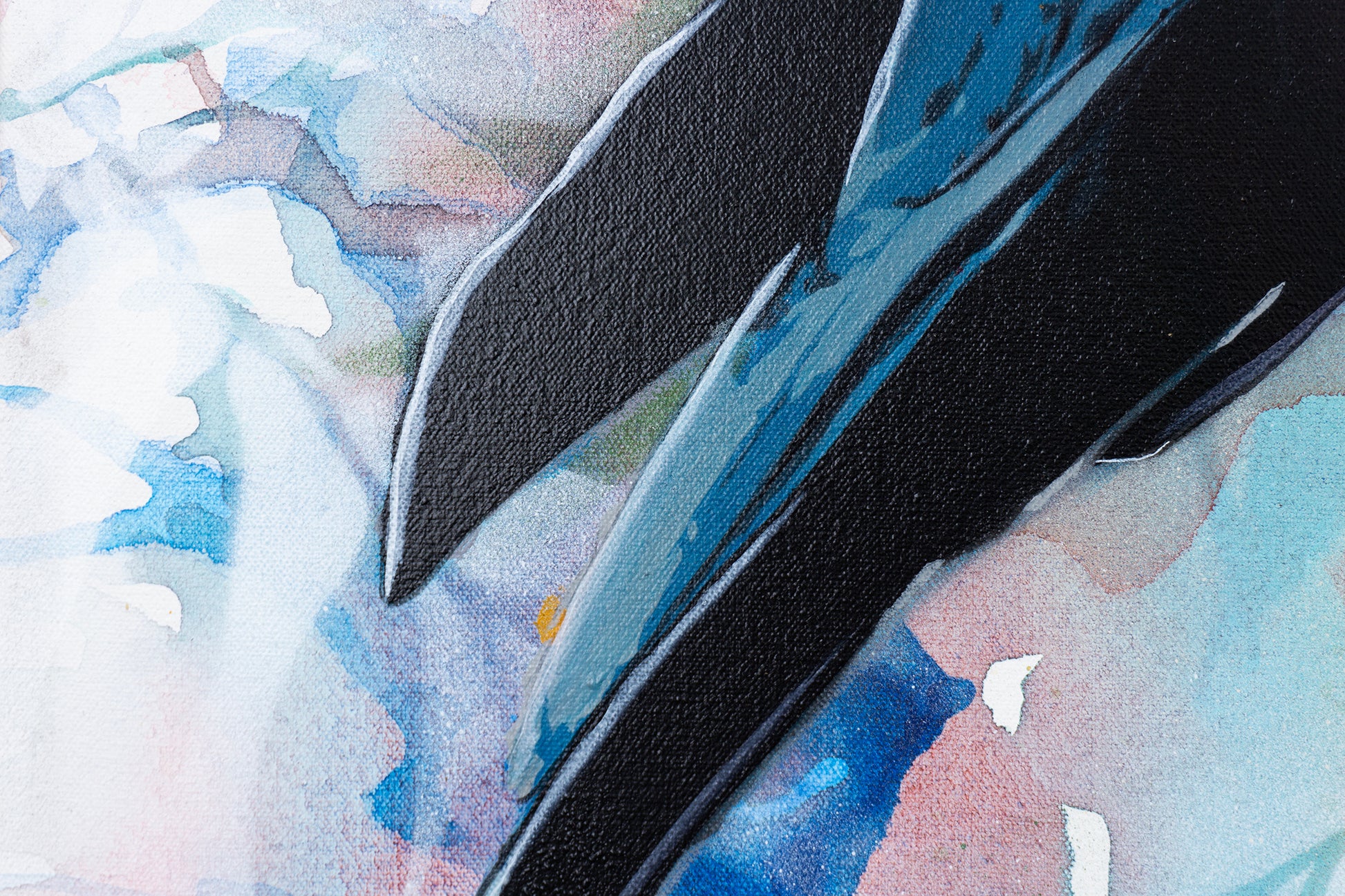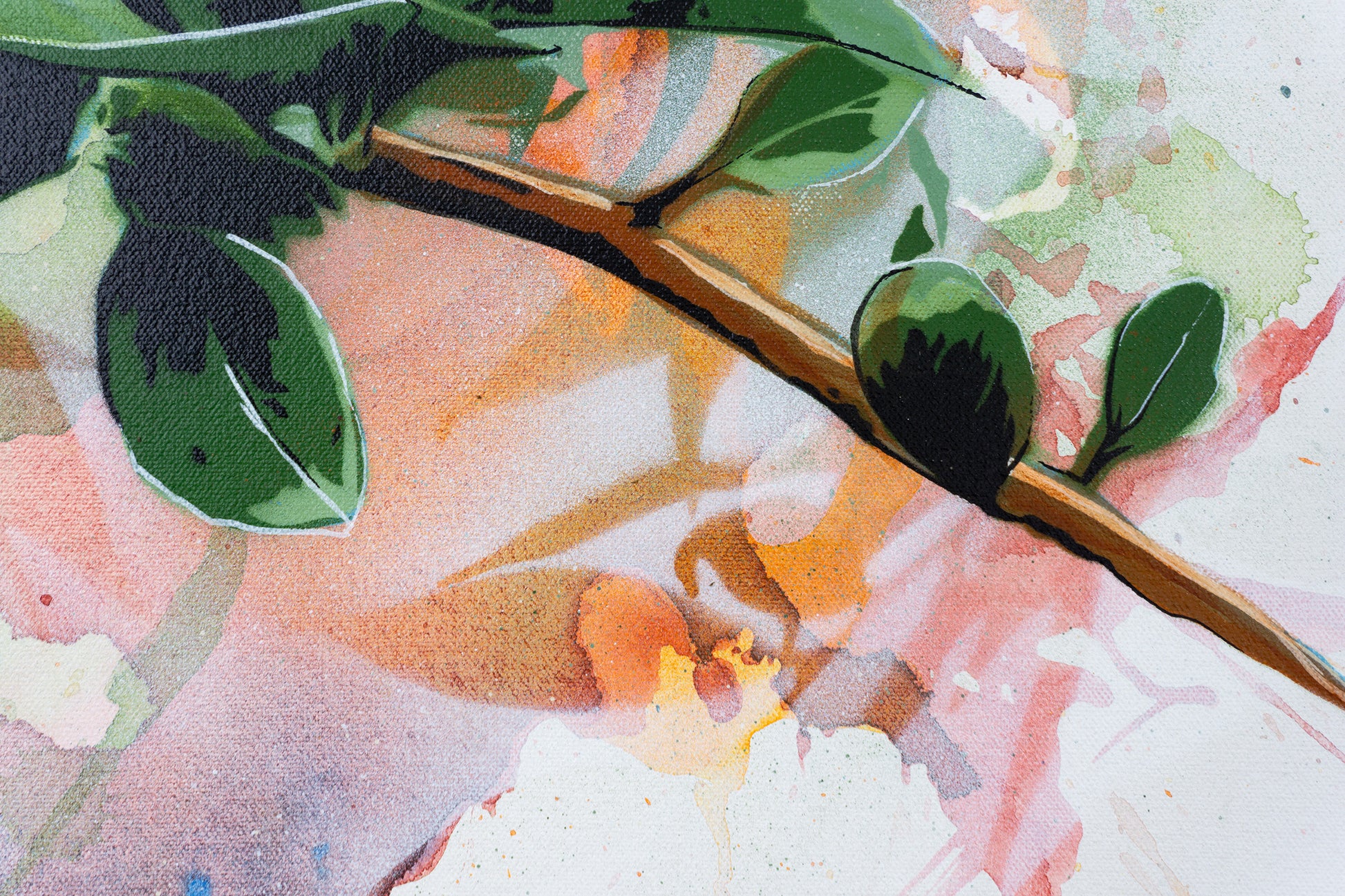 70 x 70cm (73 x 73 framed), Acrylic & aerosol on canvas, this piece is framed in a natural oak floating frame.
