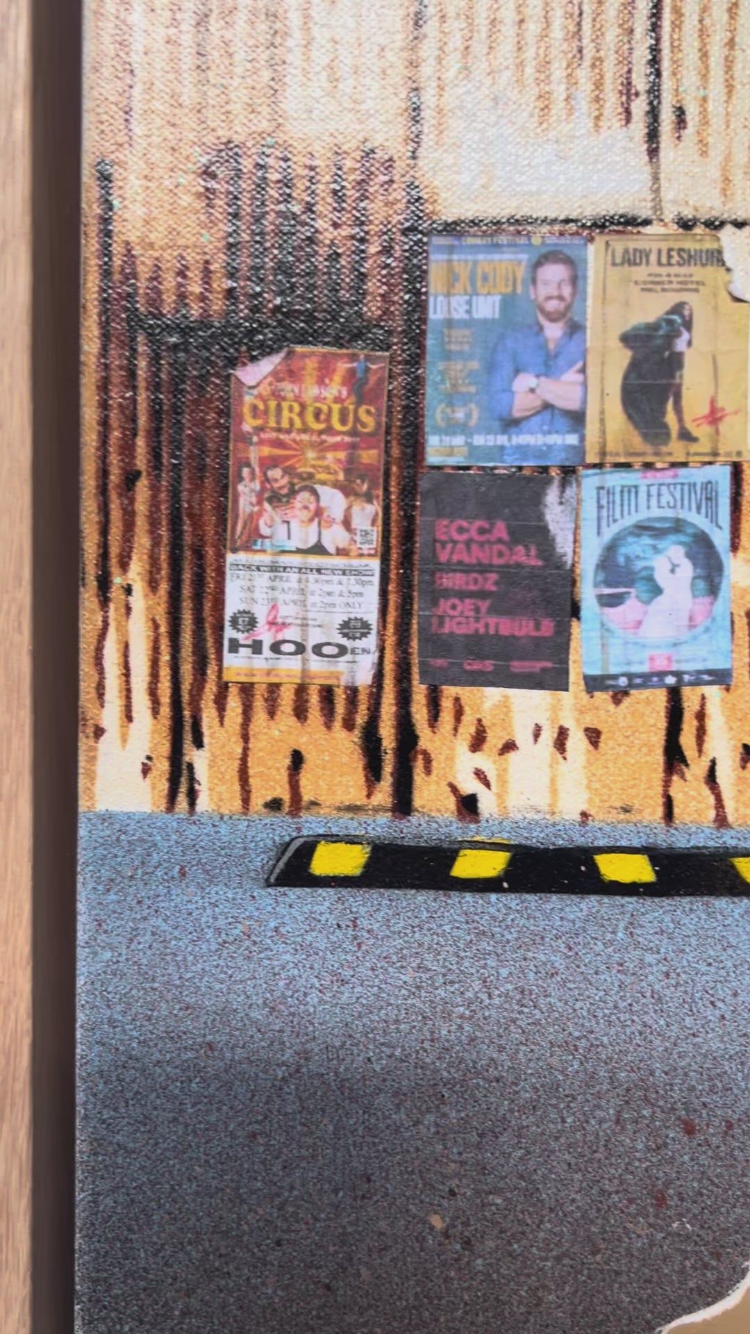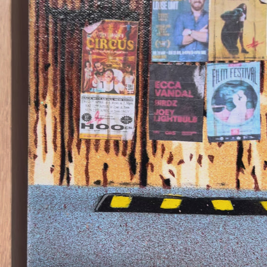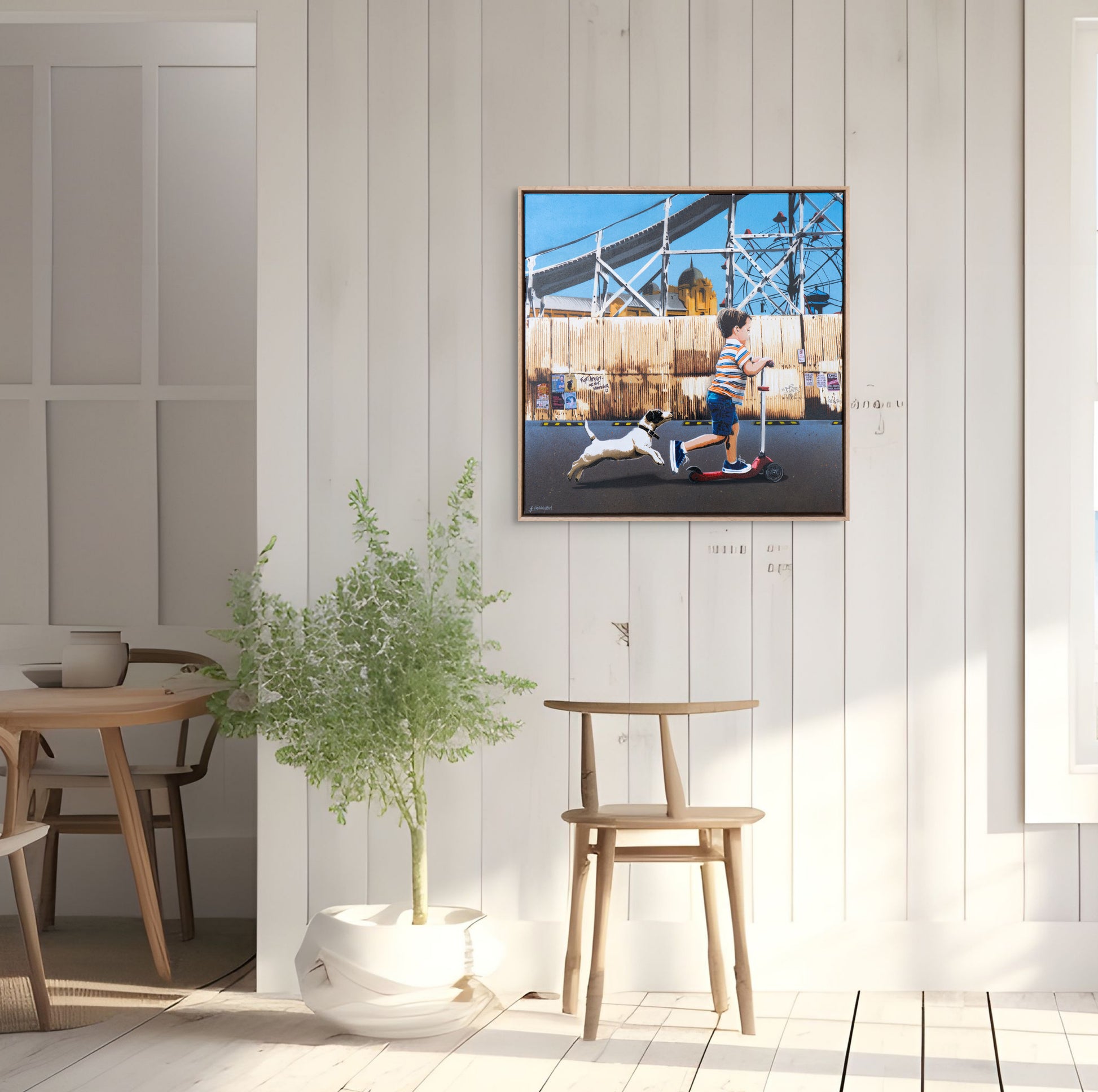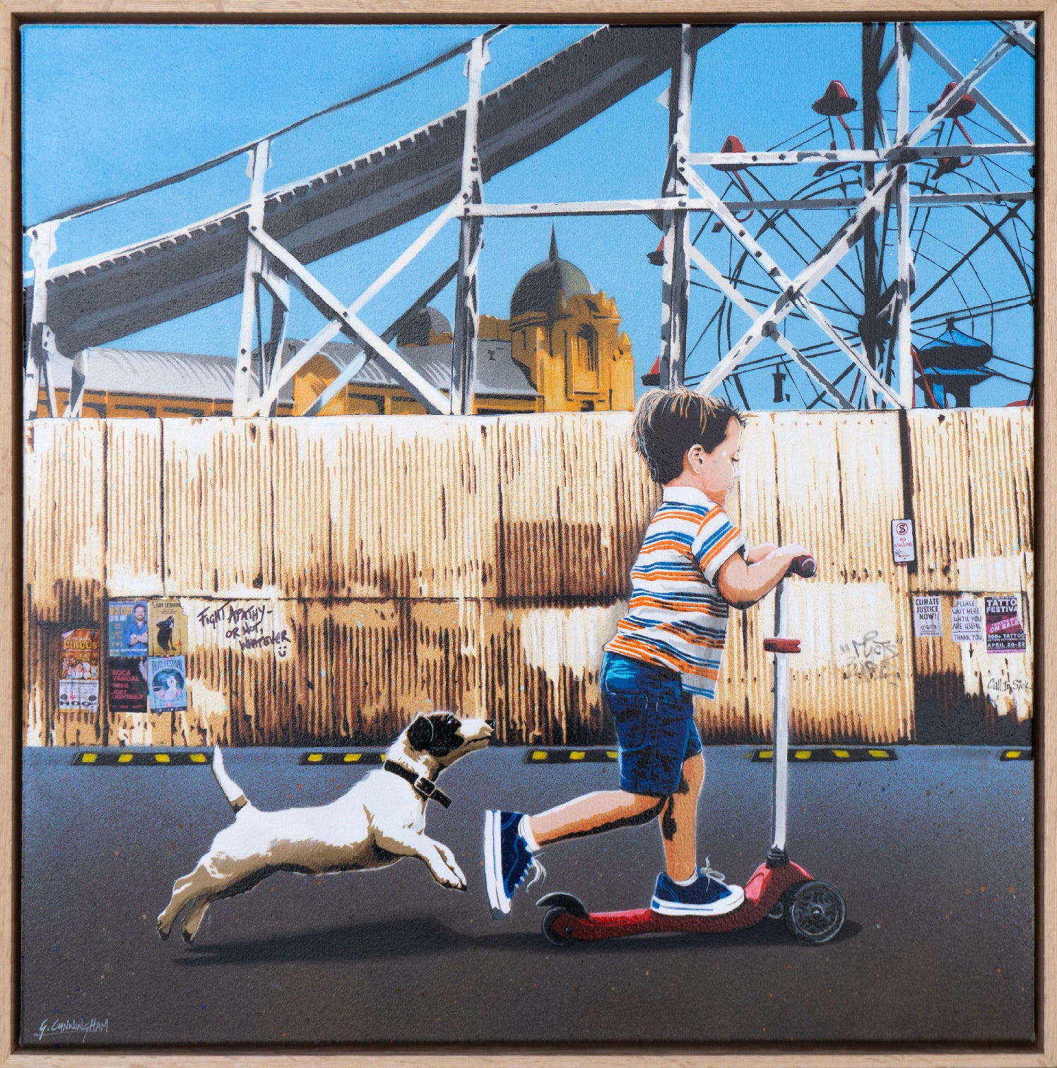 Acrylic & aerosol on canvas - 70 x 70 cm. Framed in American oak (73 x 73cm). Free delivery Australia wide.