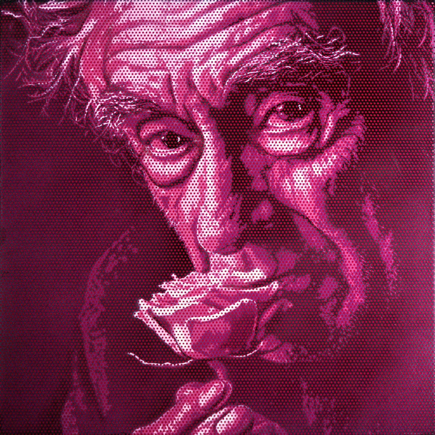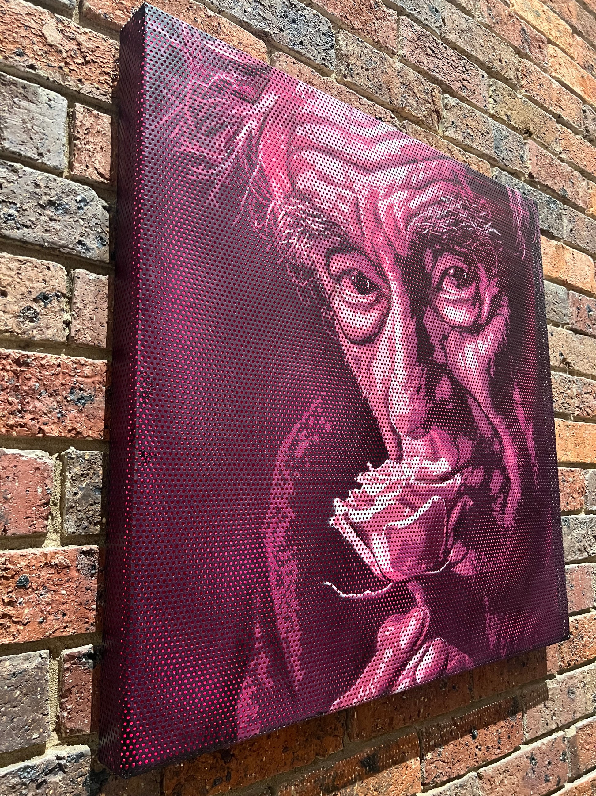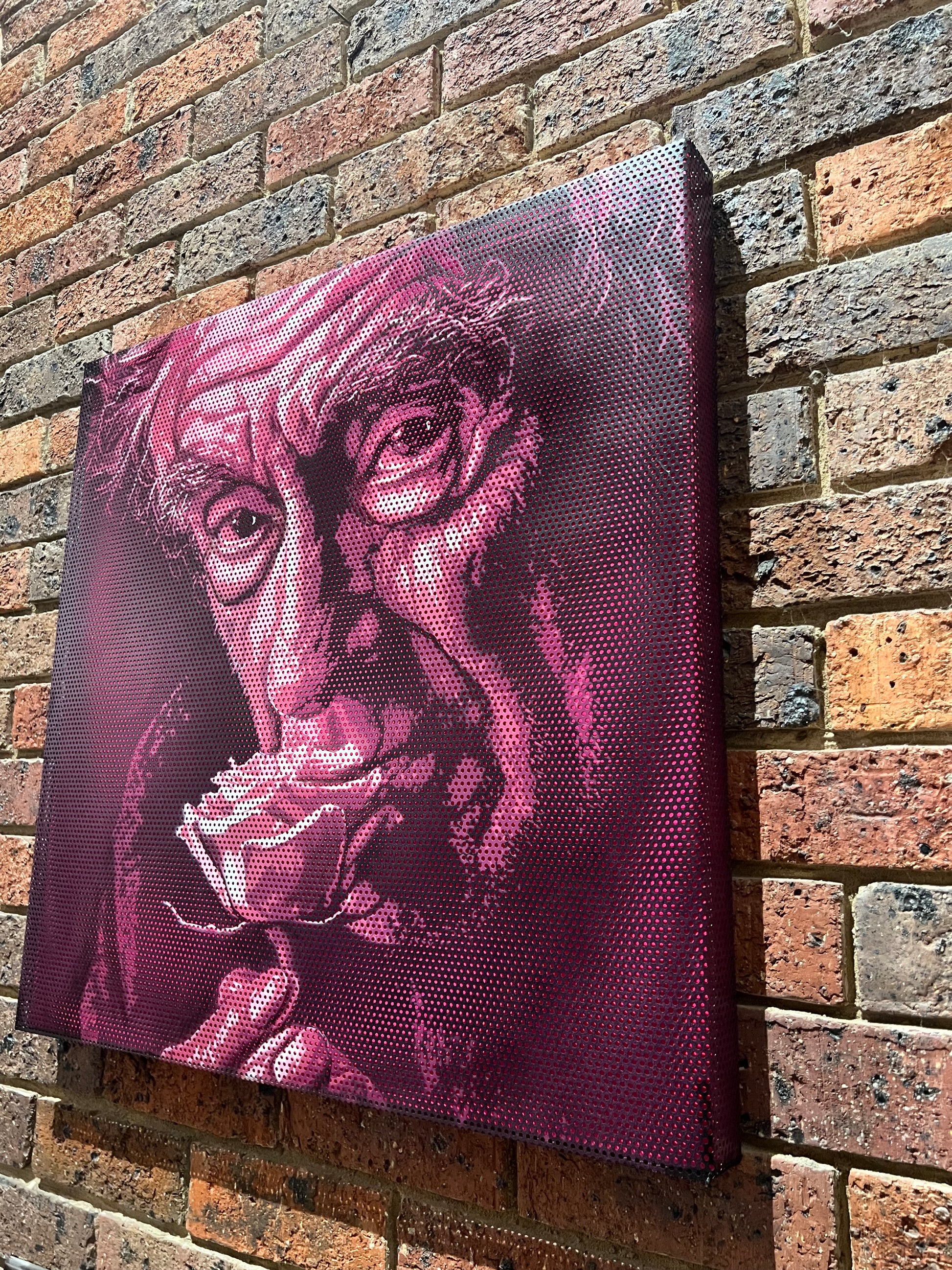 This new series uses my usual stencil technique, but this time the subjects are not inspired by memory or place - but are portraits created using AI - faces made from code. Using perforated steel as my "canvas", suspended over fluorescent backgrounds, each image plays with light and perception - asking: where does human identity end, and digital mimicry begin?