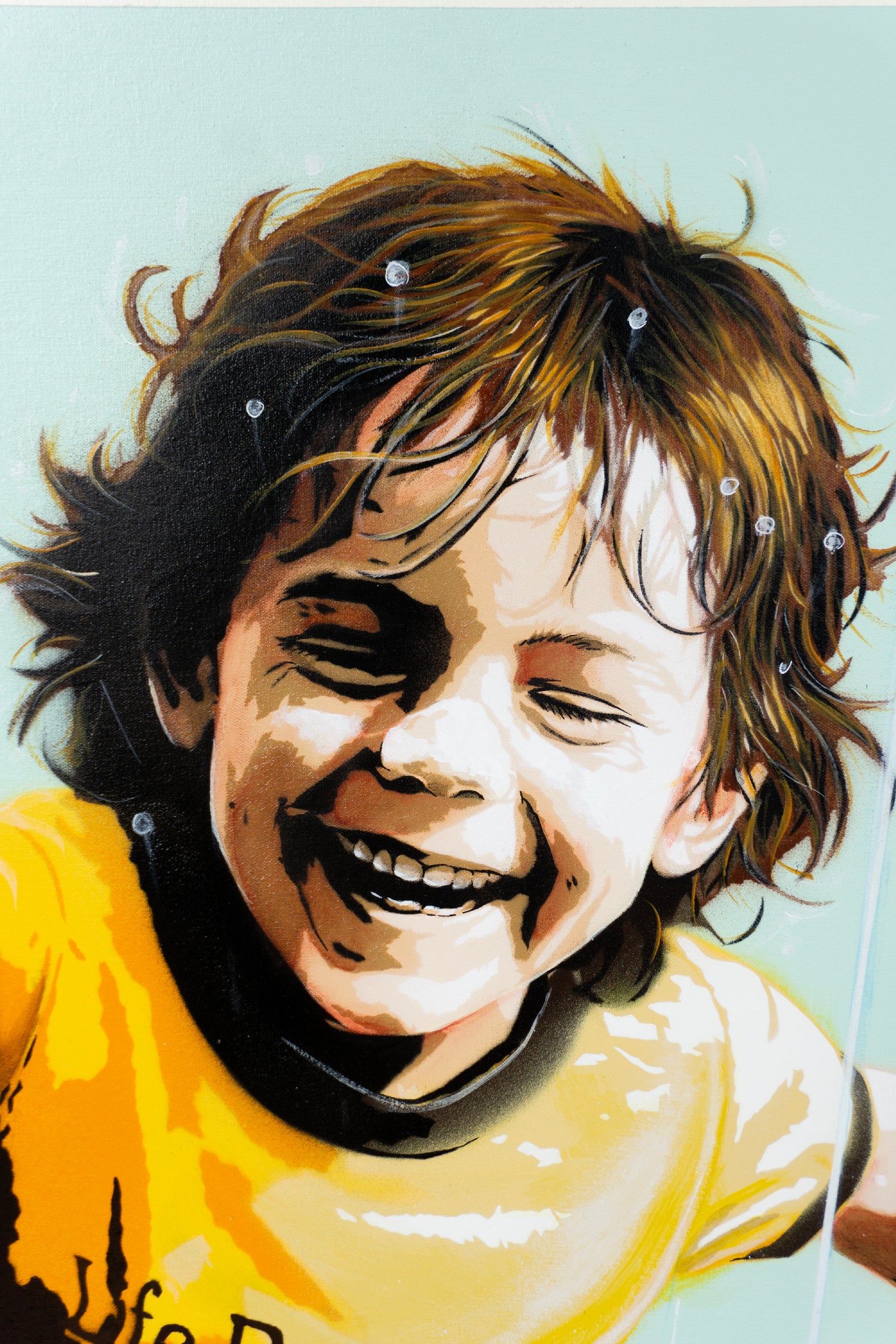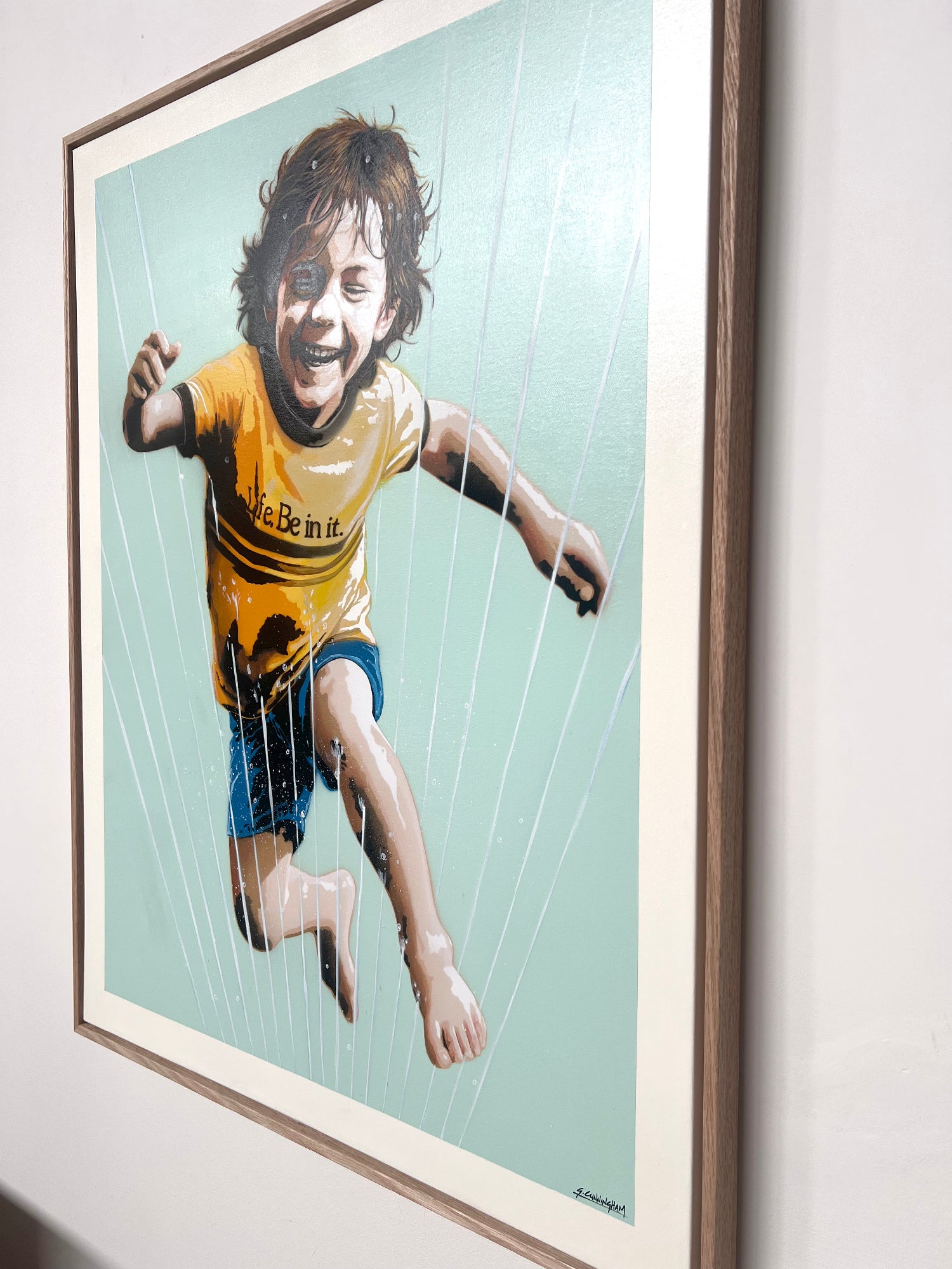 65 x 85cm (68 x 88 framed), Acrylic & aerosol on canvas, this piece is framed in a sleek low profile natural oak floating frame.