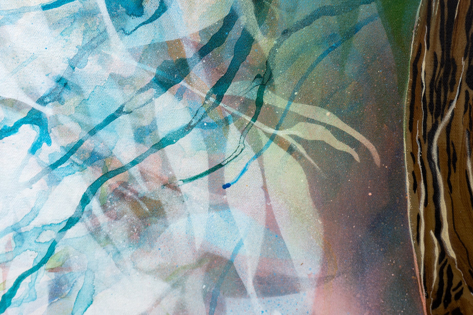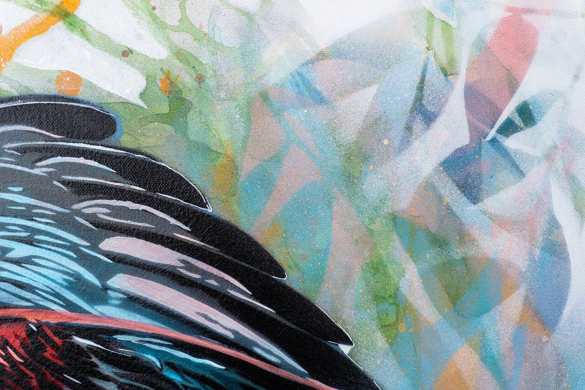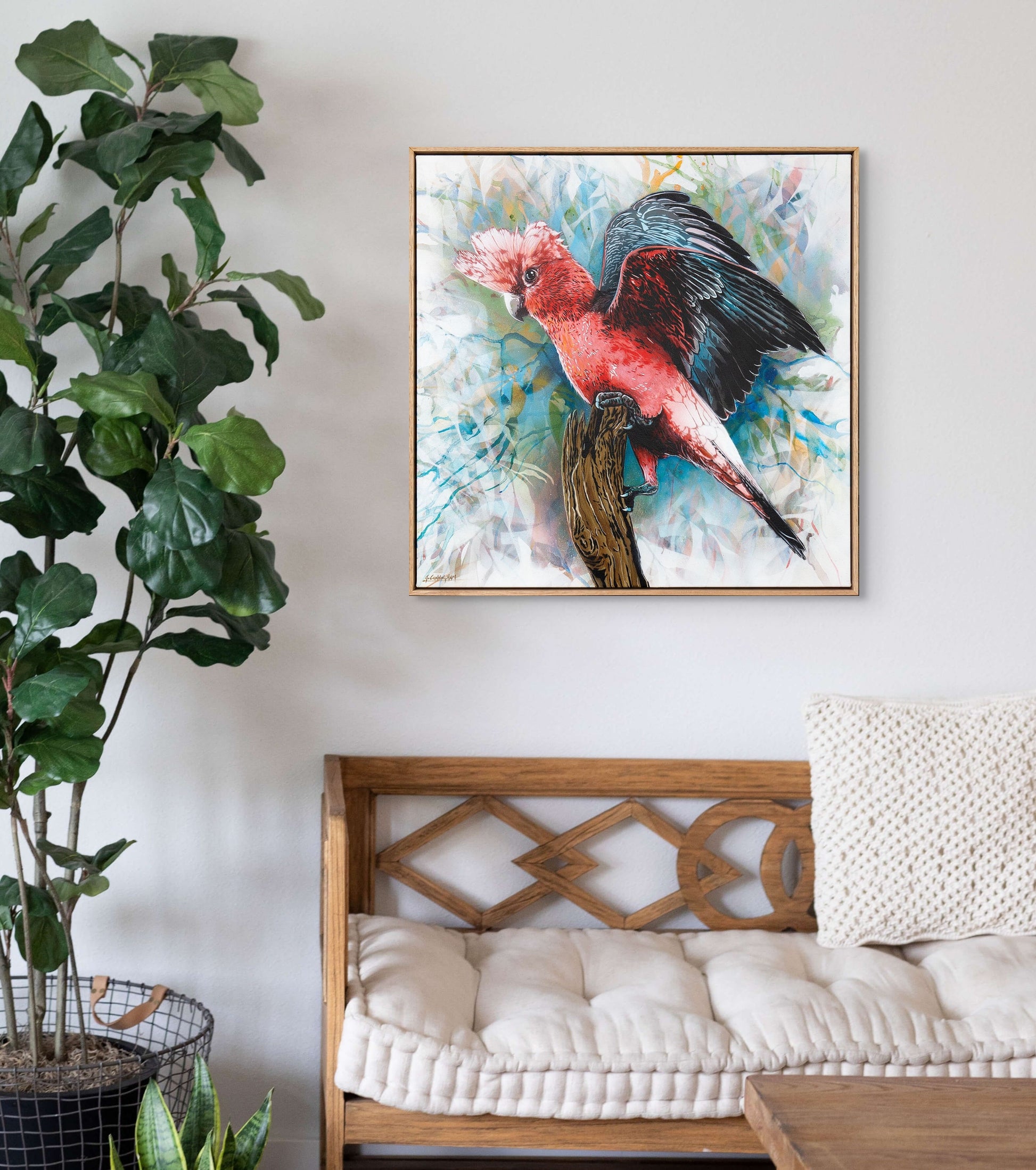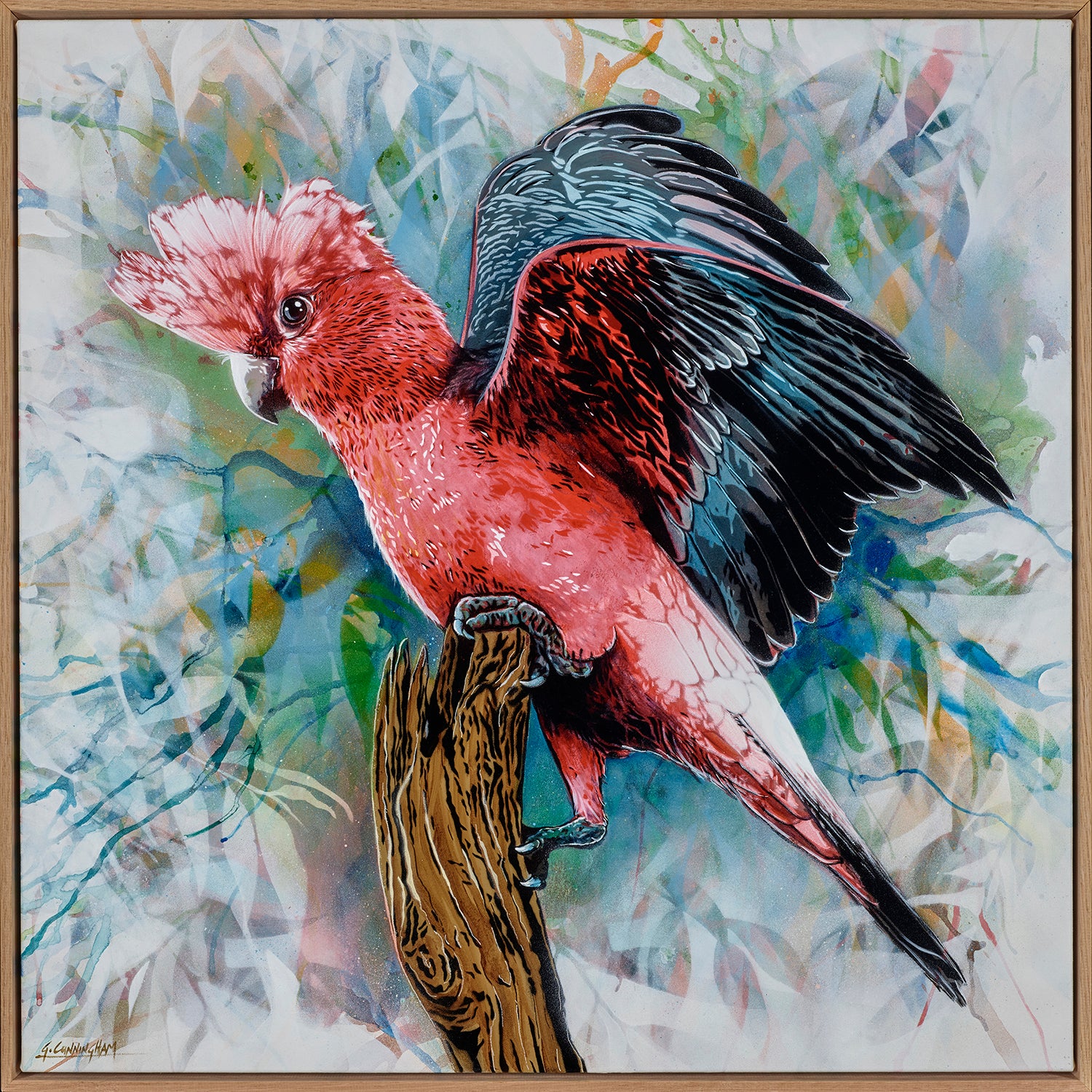 70 x 70cm (73 x 73 framed), Acrylic & aerosol on canvas, this piece is framed in a natural oak floating frame.