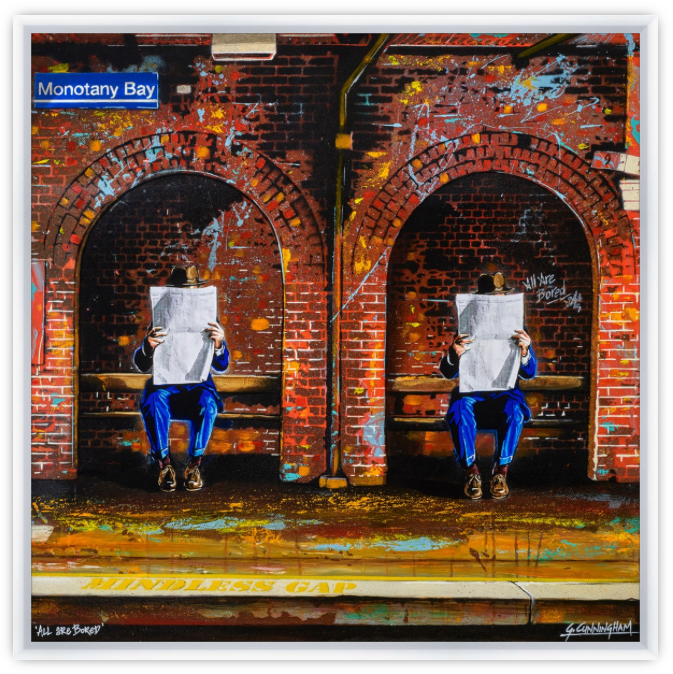 Prior to becoming a professional artist, I remember the drudgery of catching public transport to work everyday. It can be a soul destroying experience, which is what I am conveying here as the identical businessmen are waiting for their train.