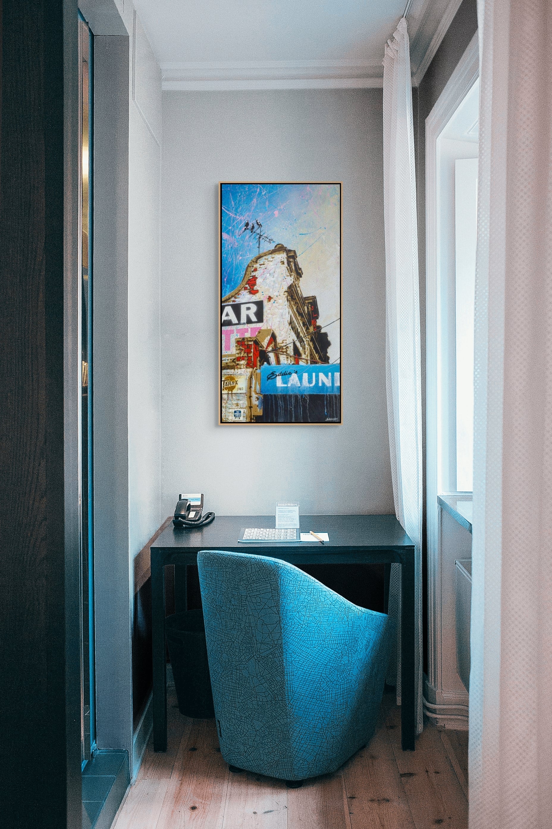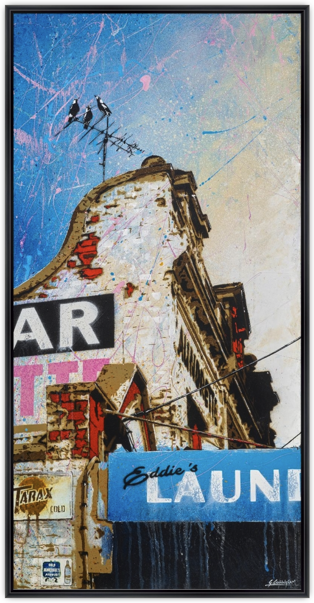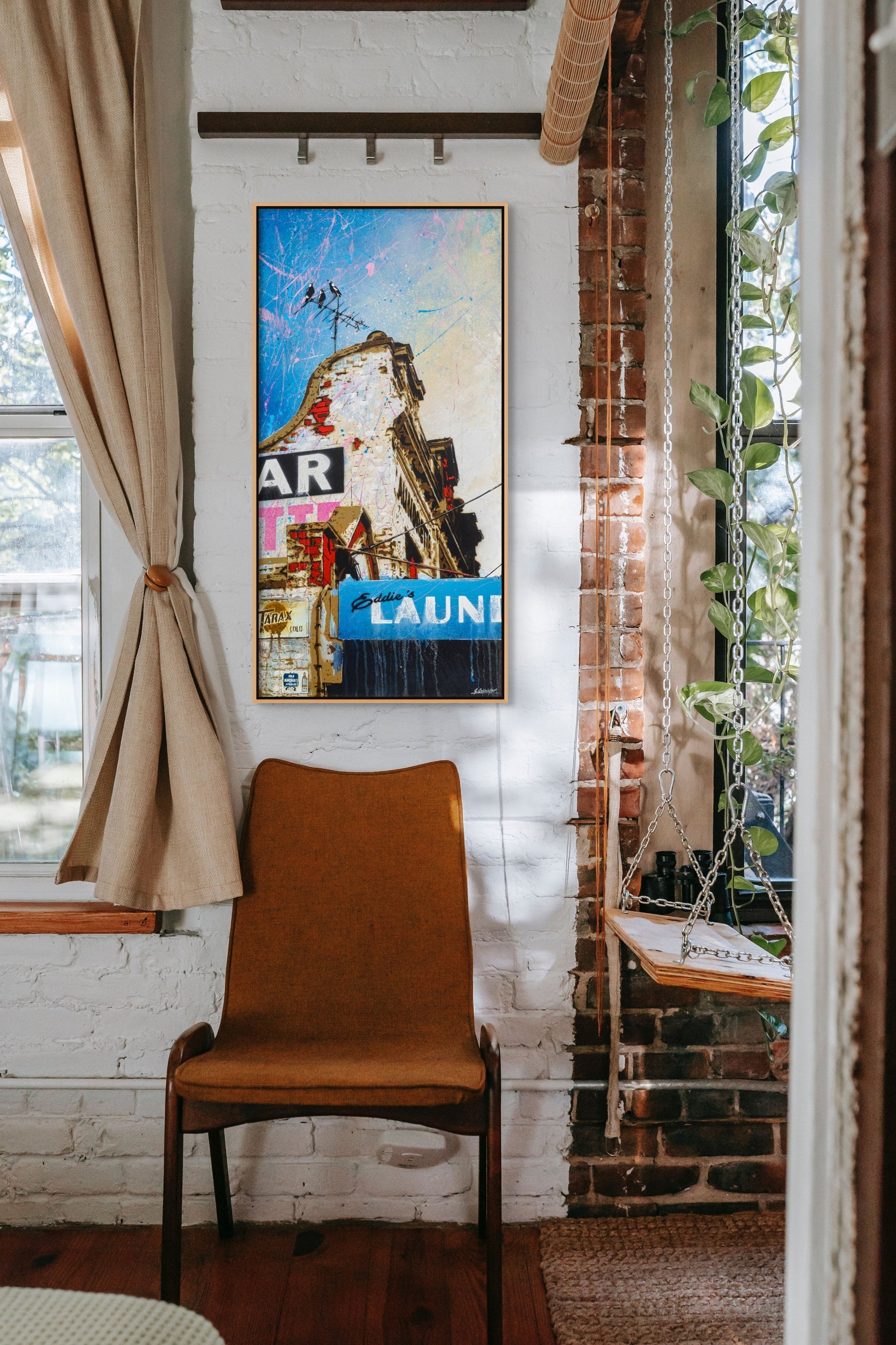 I walked around my own home and found that this tall, skinny sized canvas fits in some smaller, more awkward spaces. The more impressionistic style really adds to the dilapidated feel and helps to symbolise the disappearance of the traditional Aussie milk bar and street shopping strip in favour of large shopping centres where all the shops are variations on the same thing.