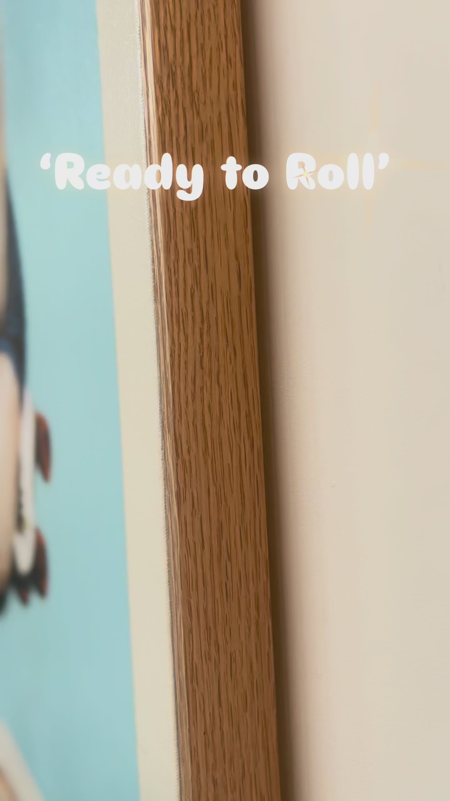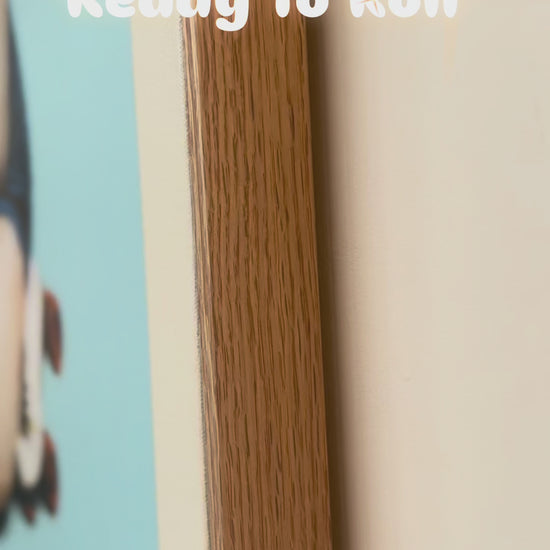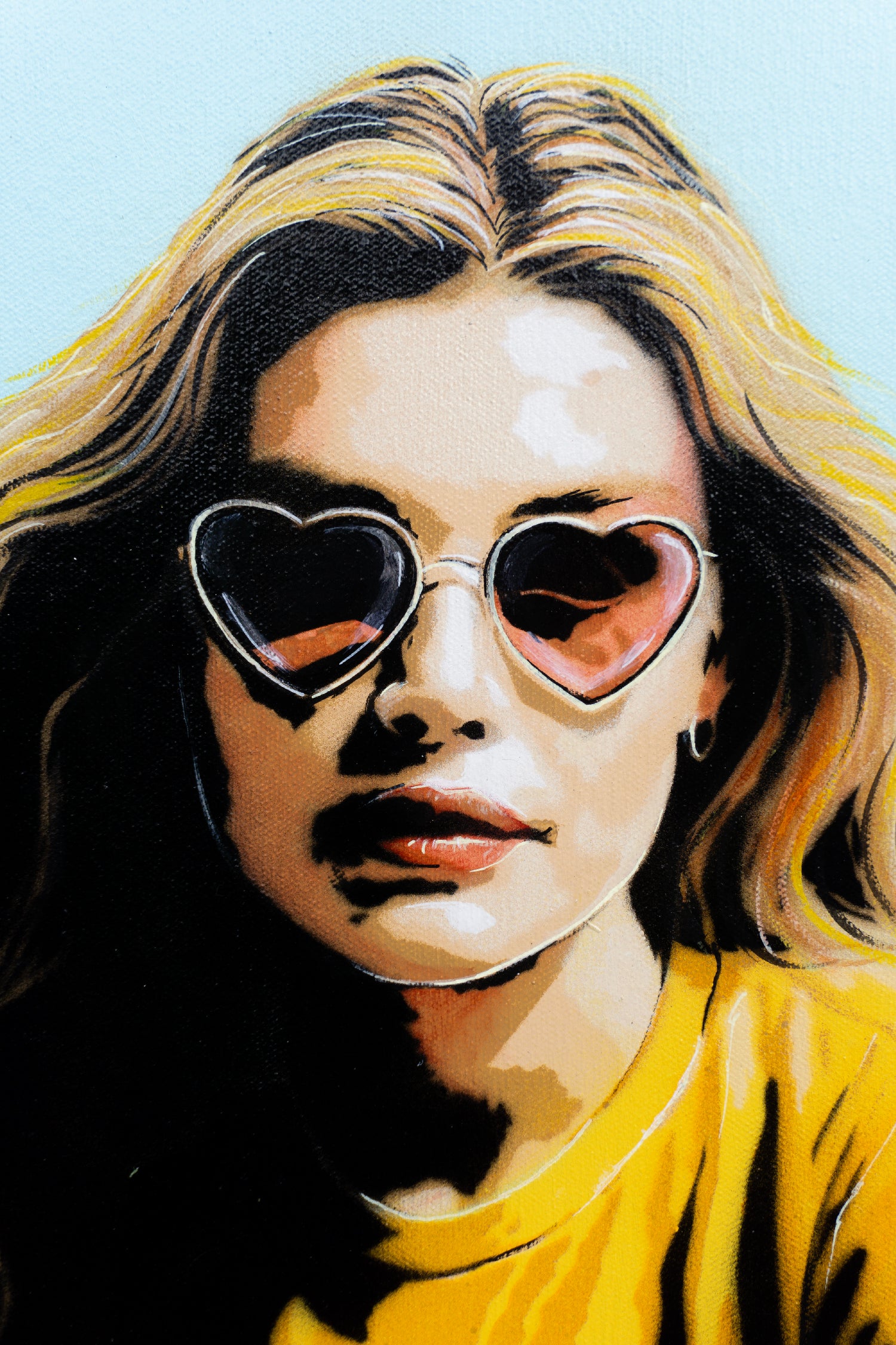 65 x 85cm (68 x 88 framed), Acrylic & aerosol on canvas, this piece is framed in a sleek low profile natural oak floating frame.