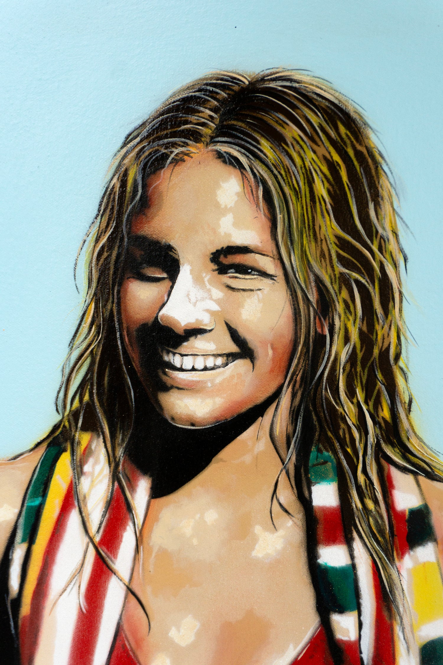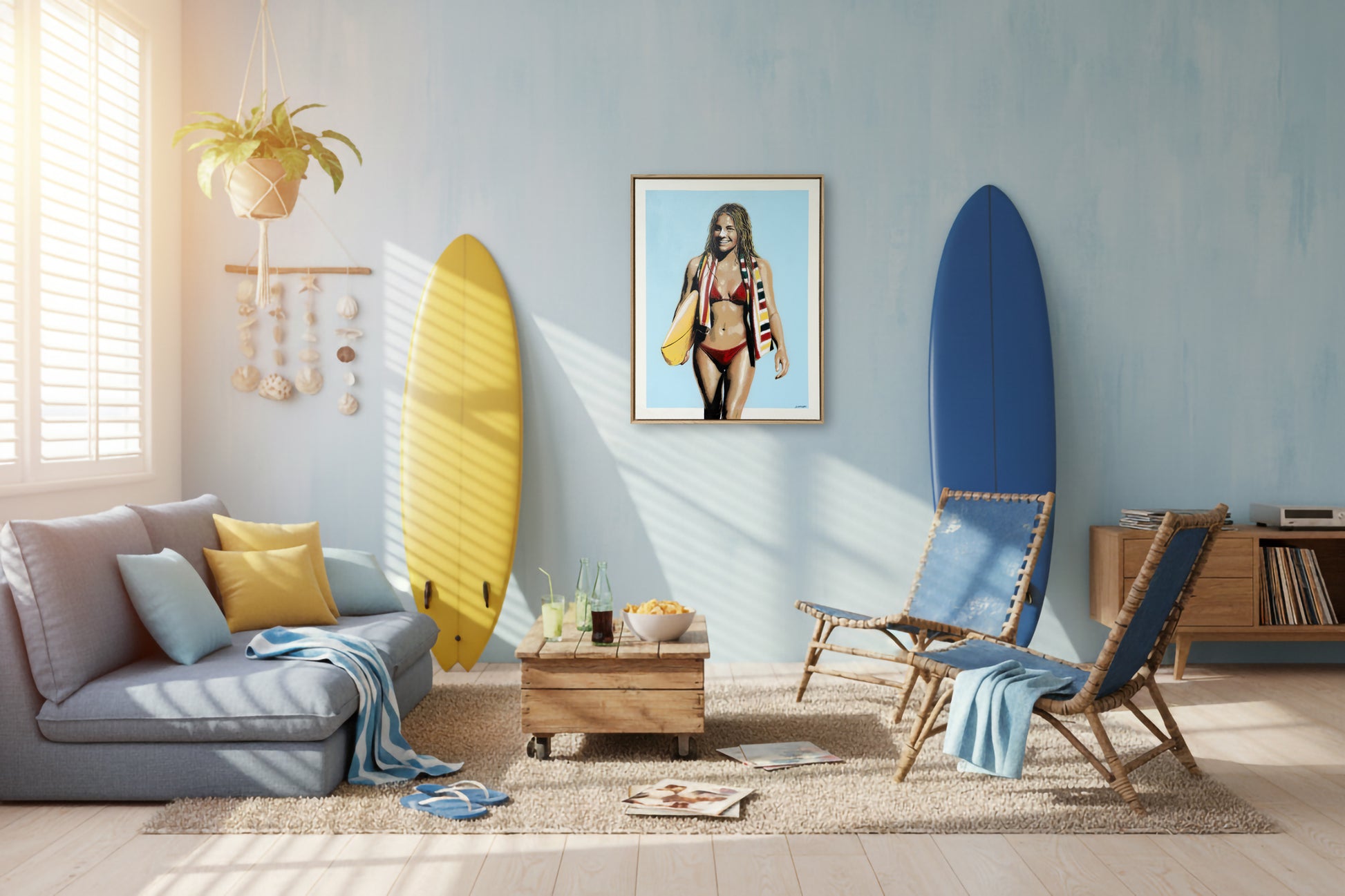 "'Sunshine State' captures the essence of an Australian summer — golden light, salty skin, and that carefree grin that only comes after a great surf. Wrapped in stripes and confidence, she’s the spirit of those endless beach days: bold, natural, and utterly alive."