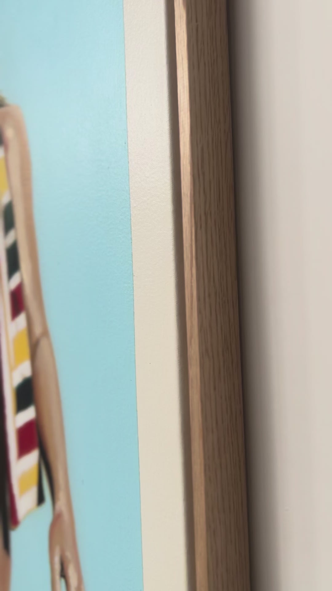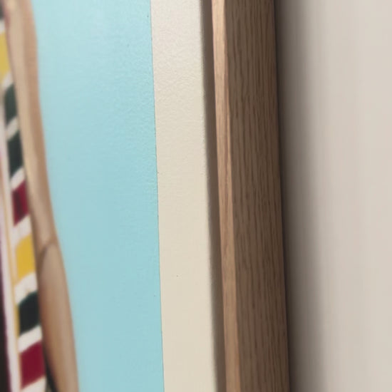 65 x 85cm (68 x 88 framed), Acrylic & aerosol on canvas, this piece is framed in a sleek low profile natural oak floating frame.