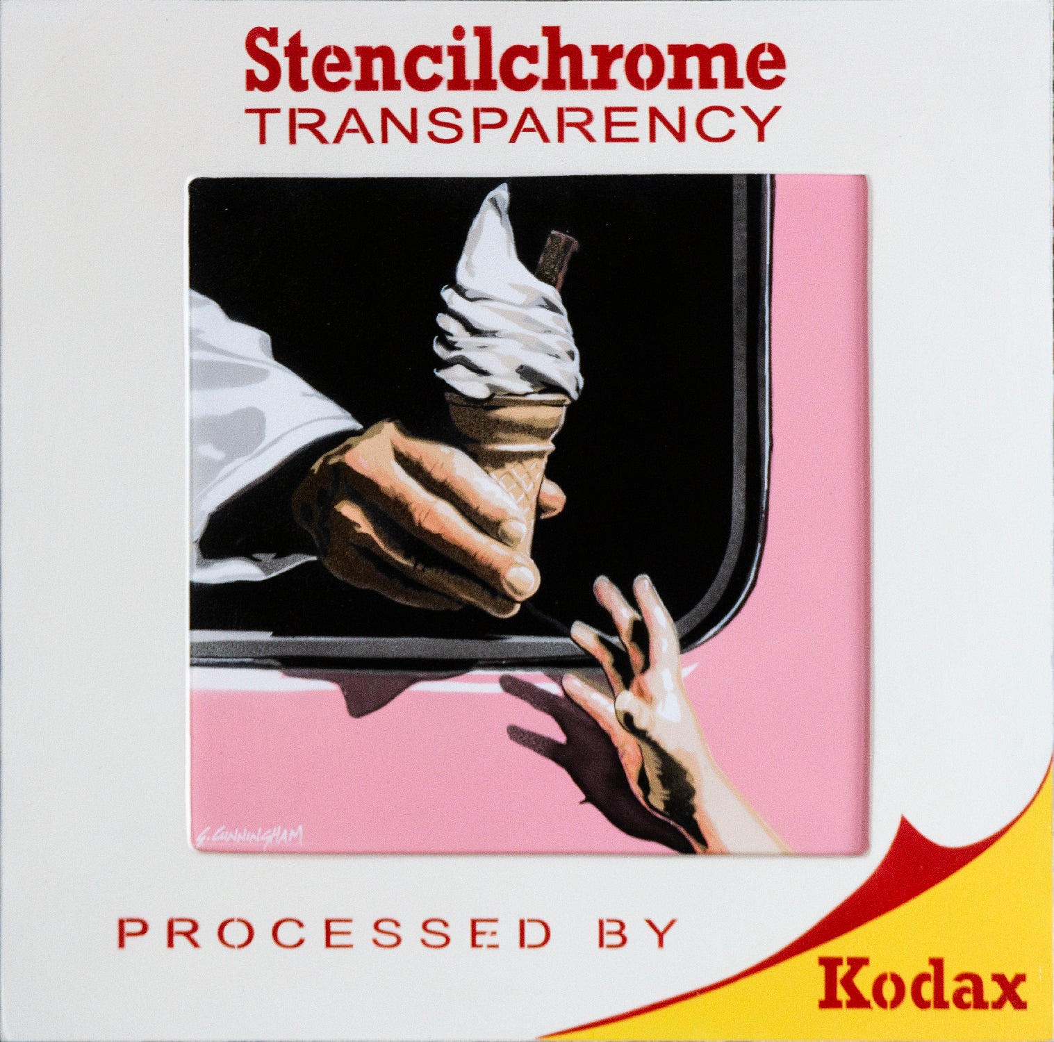 'Soft Serve' transforms the classic Mr Whippy handover into a hand-painted object artwork, presented as an oversized vintage slide. Cropped to the exact moment of exchange, the piece captures the excitement of Australian summer nostalgia, suburban childhood, and one of the simplest rituals of retro Australian life.