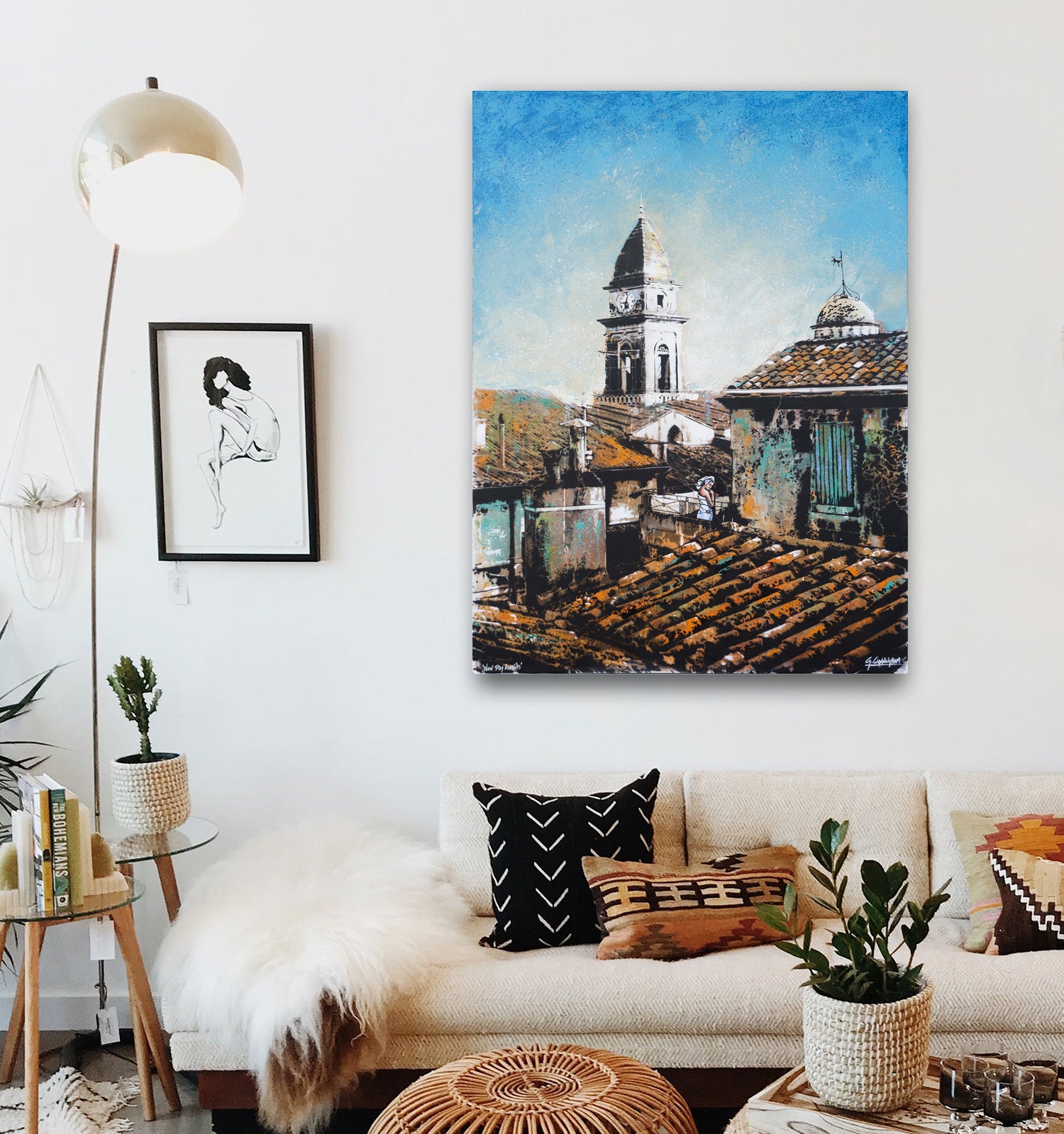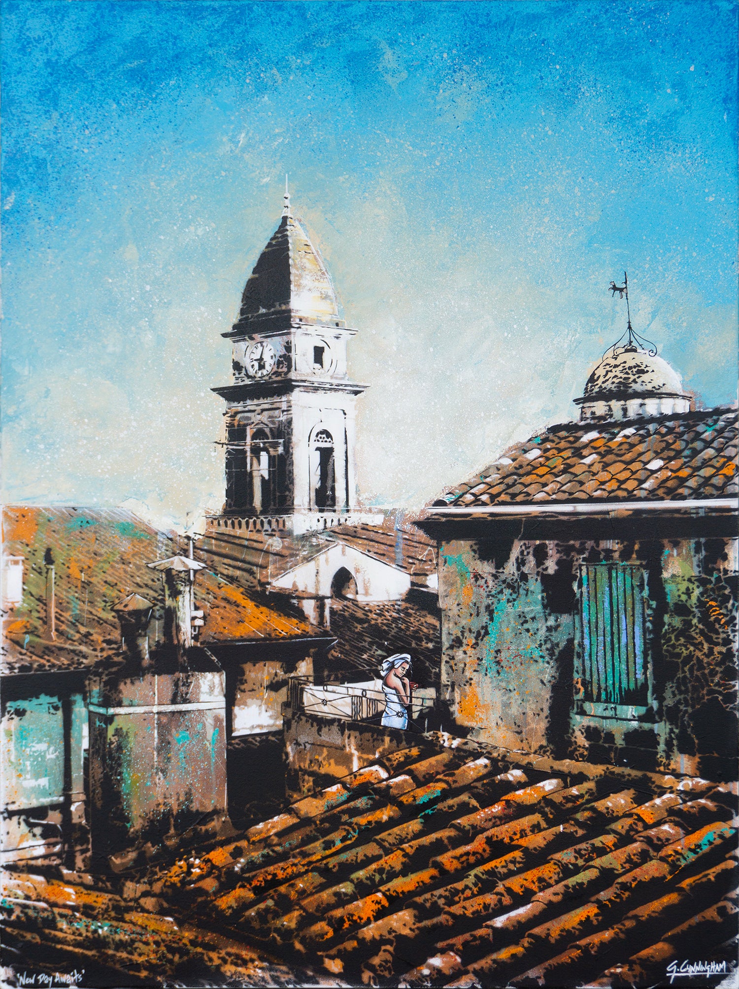 This rooftop view of an ancient French village, is based on a photo I took from my bedroom window when holidaying in Provence. I was fascinated by the endless terracotta tiles, proudly showing off centuries of dilapidation and character.