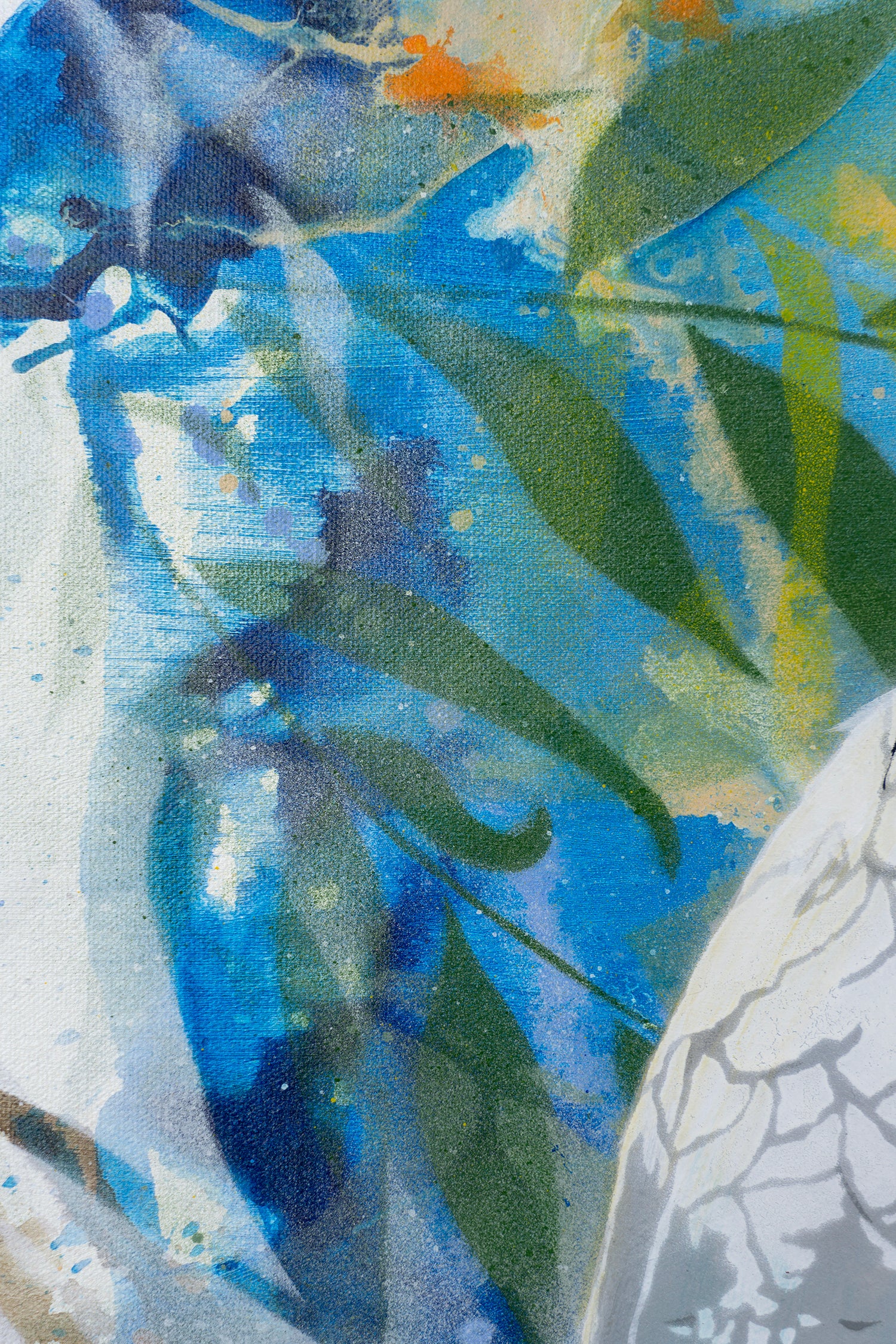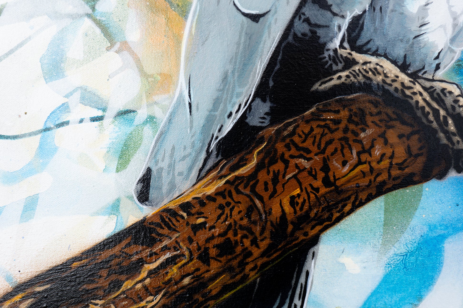 70 x 70cm (73 x 73 framed), Acrylic & aerosol on canvas, this piece is framed in a natural oak floating frame.