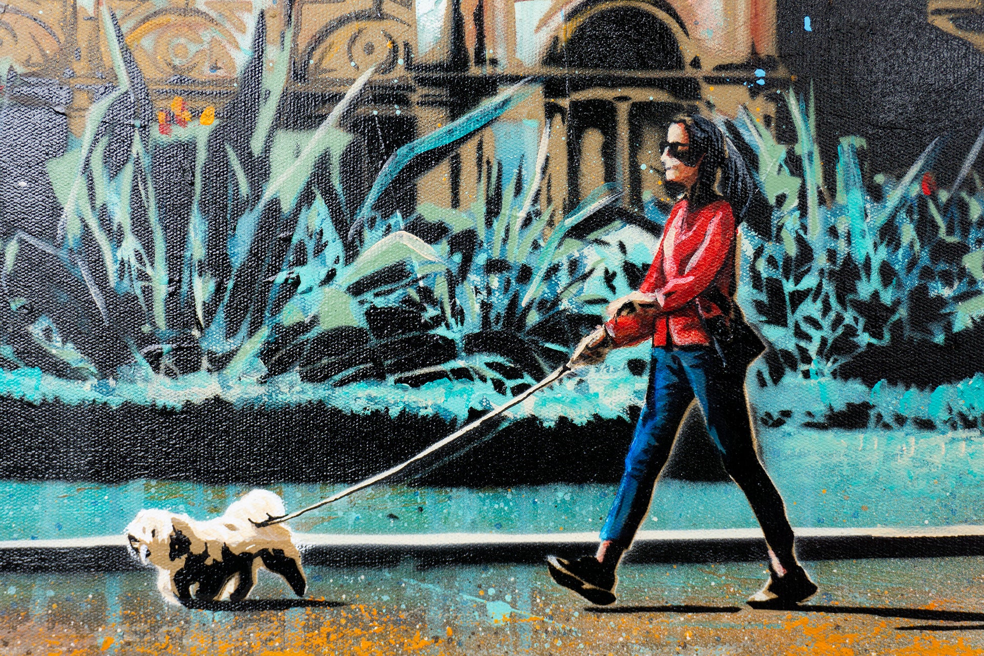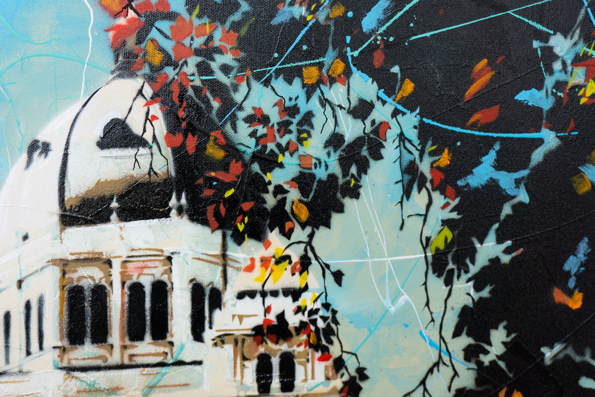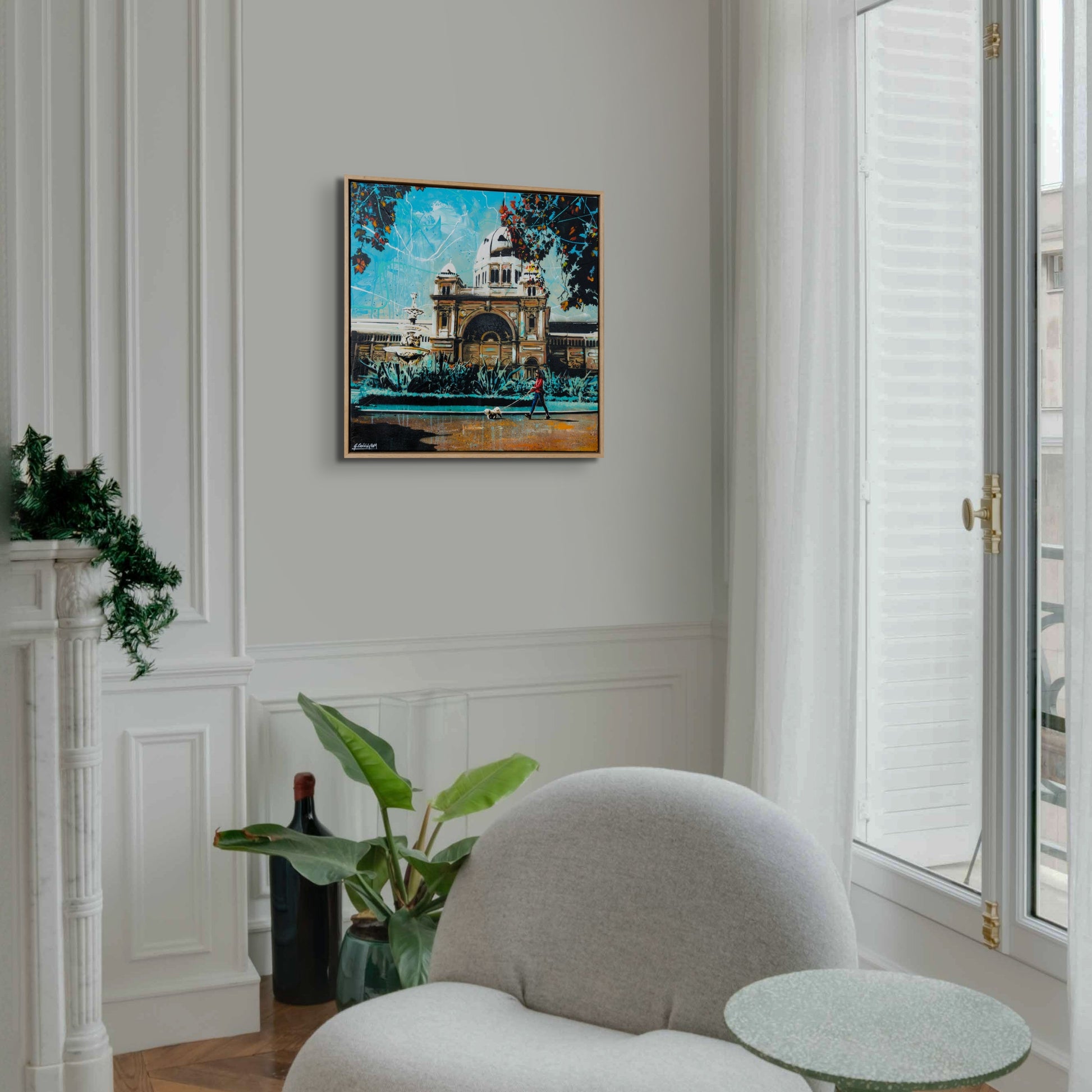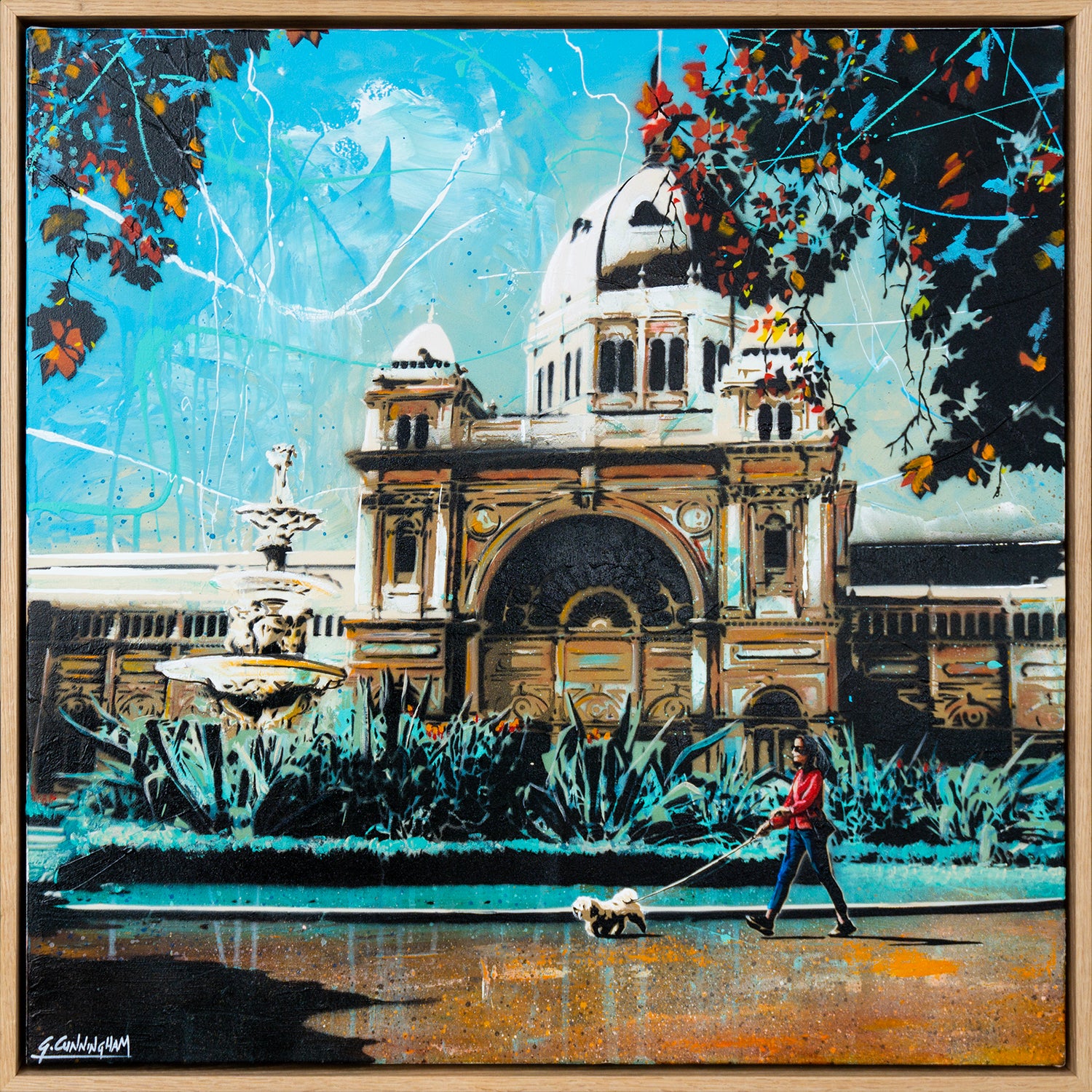 Acrylic & aerosol on canvas - 60 x 60 cm. Framed in American oak (63 x 63cm). Free delivery Australia wide.