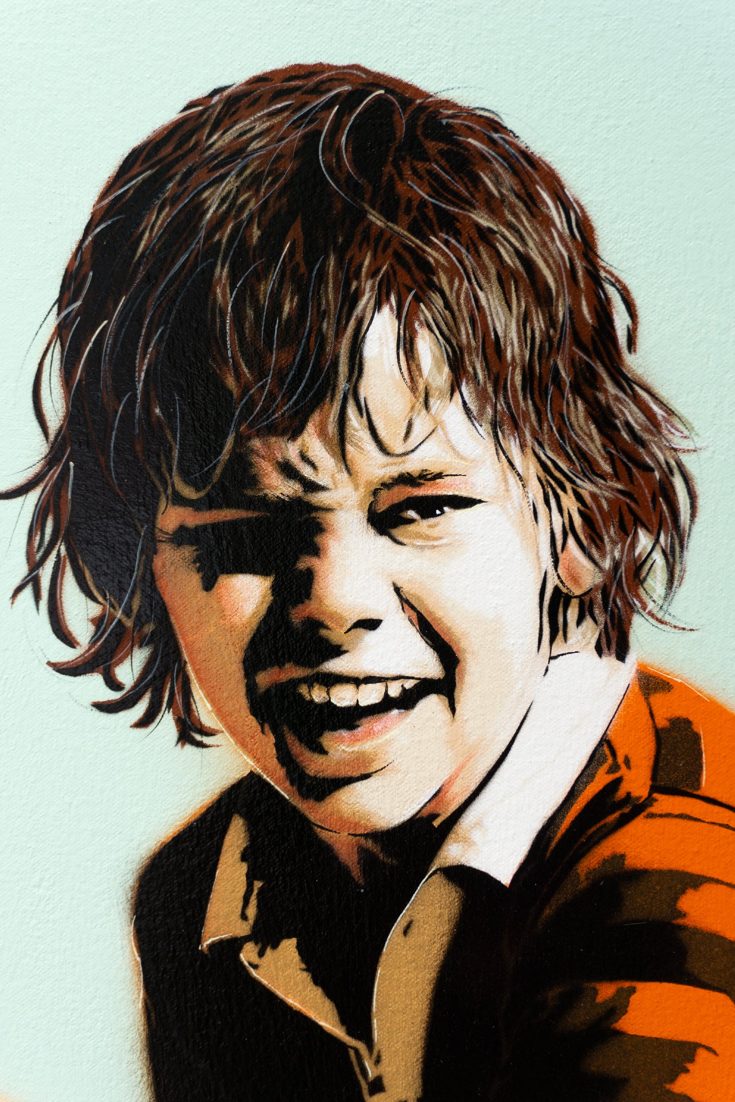 65 x 85cm (68 x 88 framed), Acrylic & aerosol on canvas, this piece is framed in a sleek low profile natural oak floating frame.
