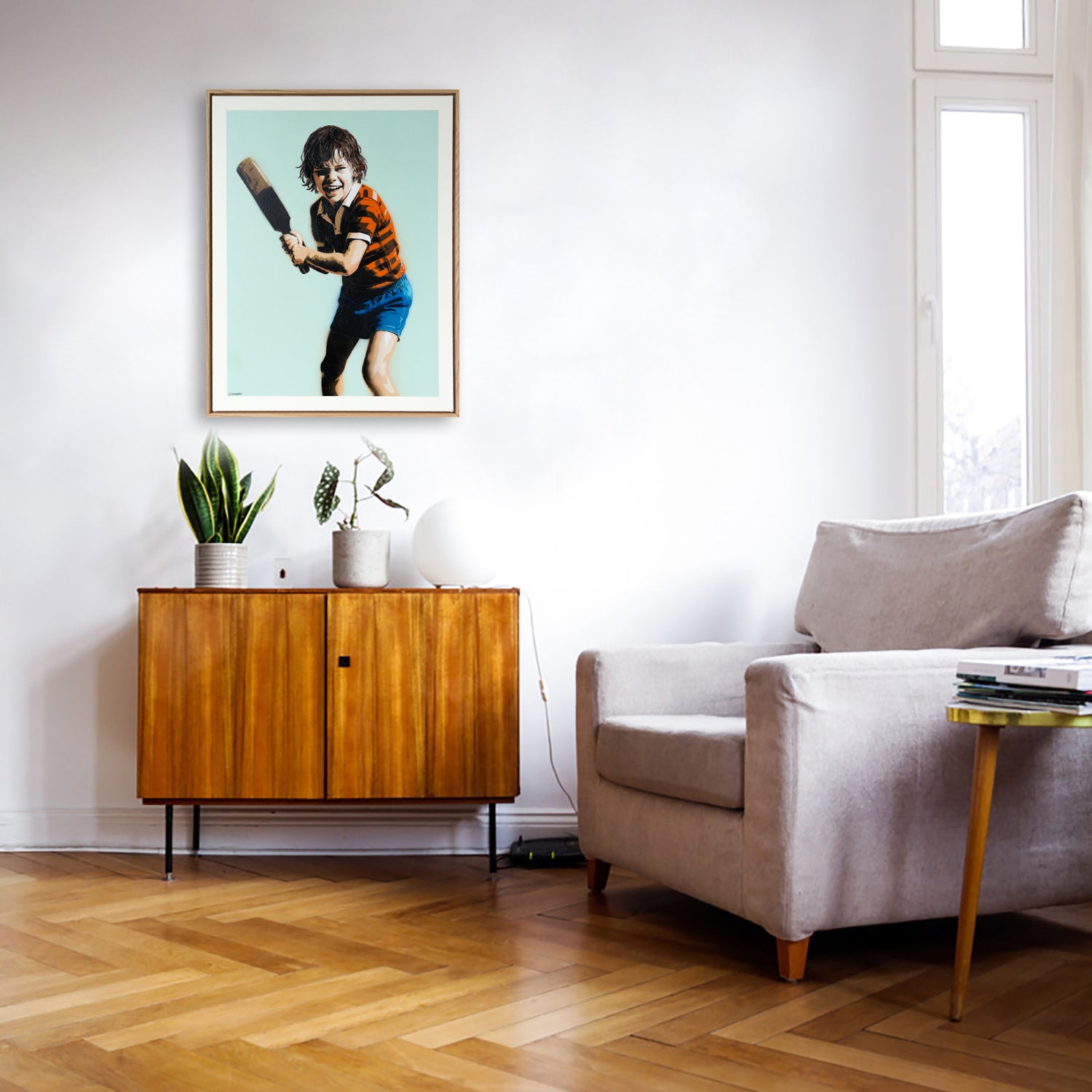 This painting captures that pure, carefree energy — the determined face, the smell of cut grass, and that moment just before the big swing. It’s a snapshot of simpler times when the biggest worry was who’d fetch the ball from next door.