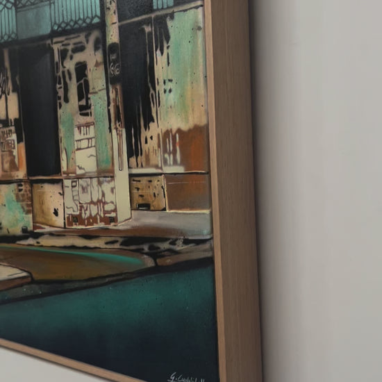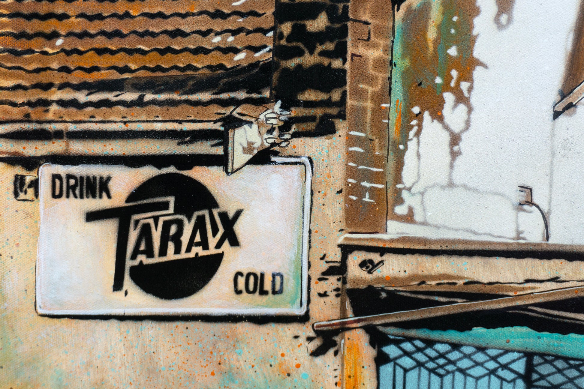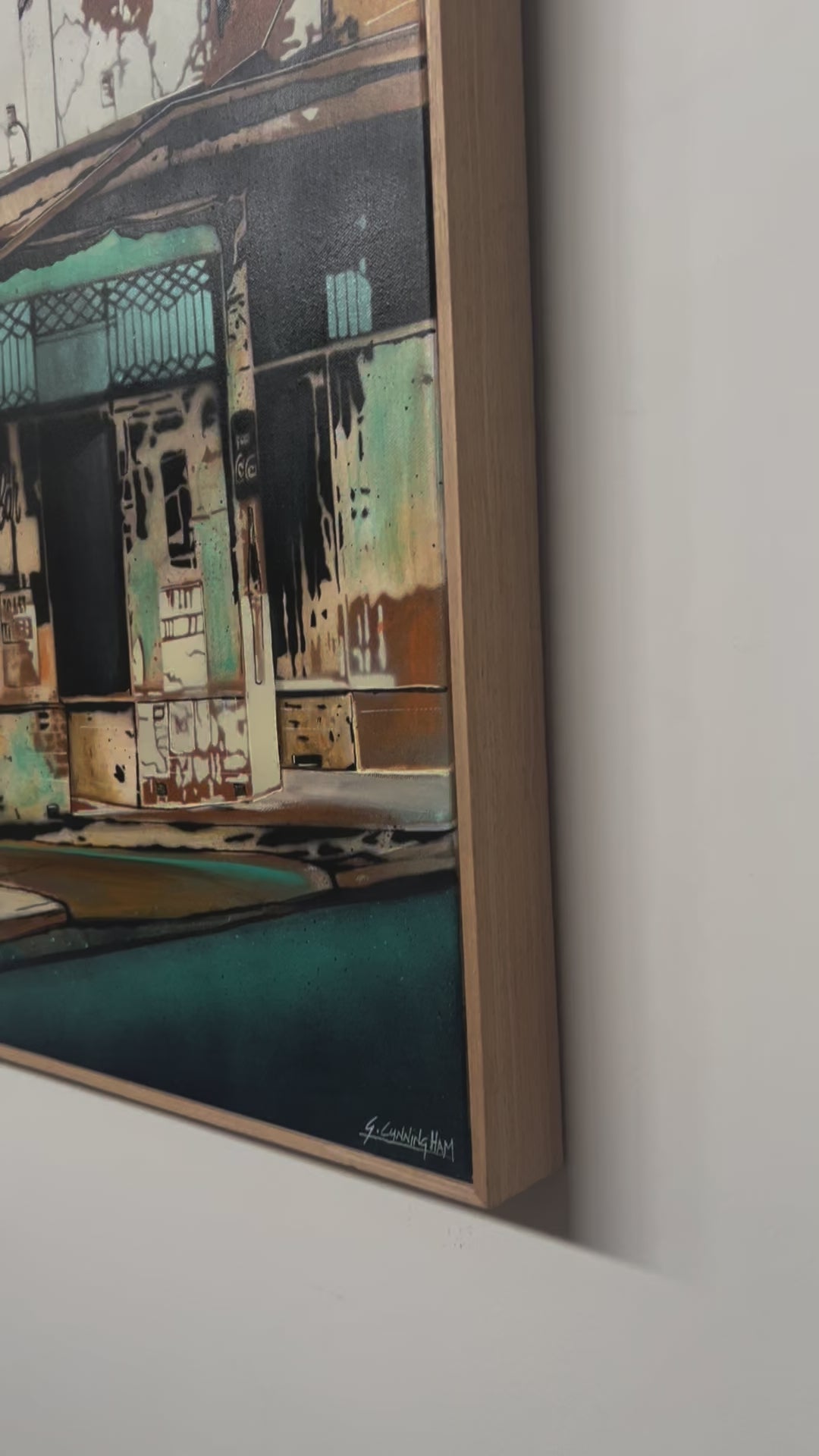 50 x 70cm (51.5 x 71.5 framed), Acrylic & aerosol on canvas, this piece is framed in a natural oak floating frame.