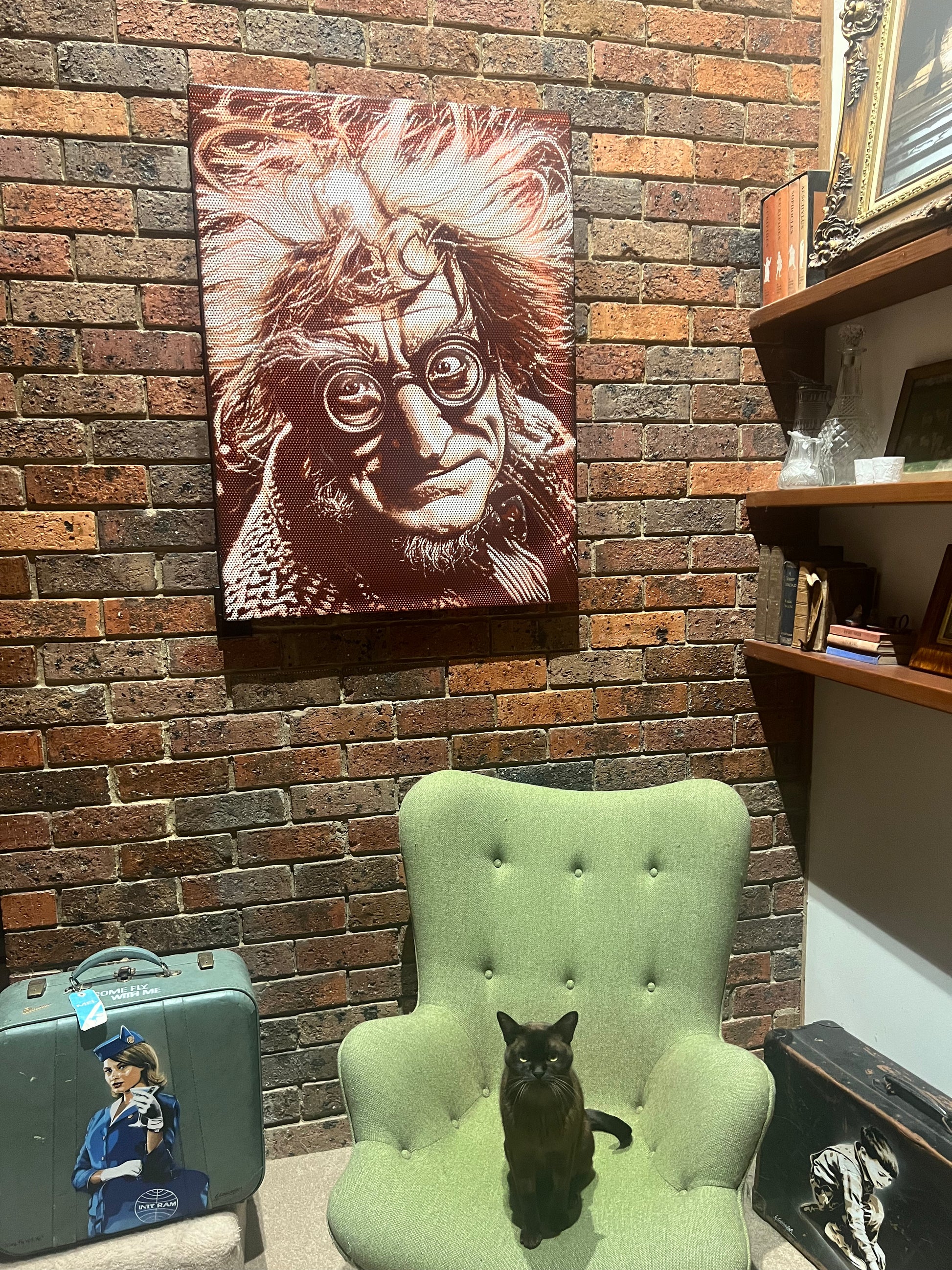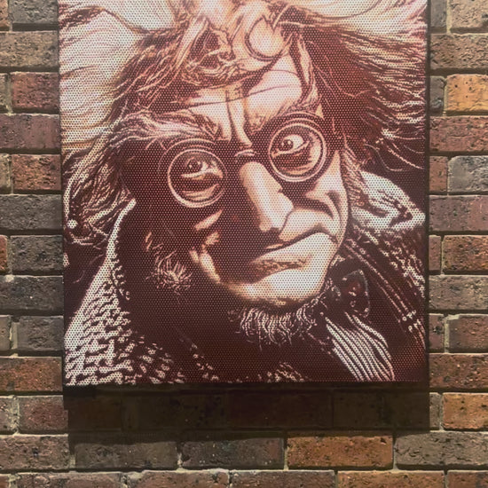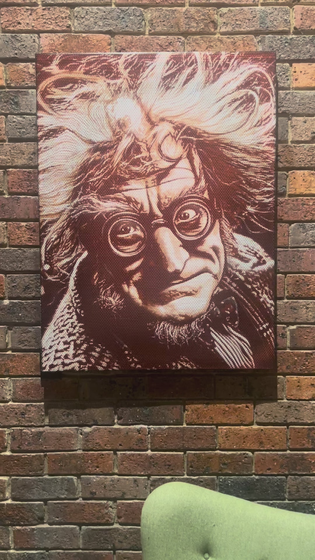This new series uses my usual stencil technique, but this time the subjects are not inspired by memory or place - but are portraits created using AI - faces made from code. Using perforated steel as my "canvas", suspended over fluorescent backgrounds, each image plays with light and perception - asking: where does human identity end, and digital mimicry begin?
