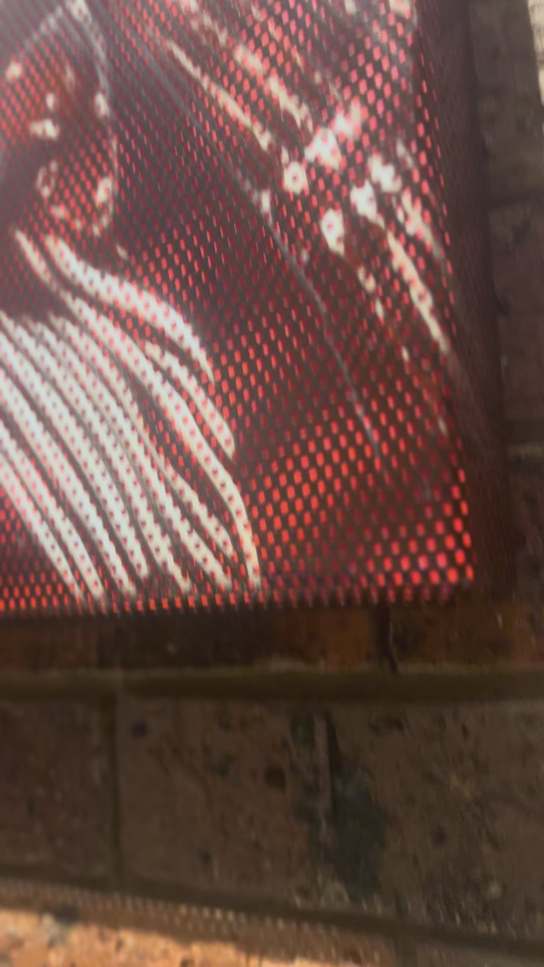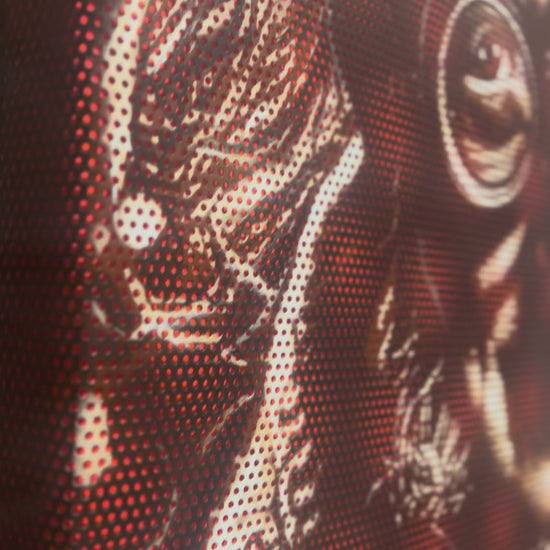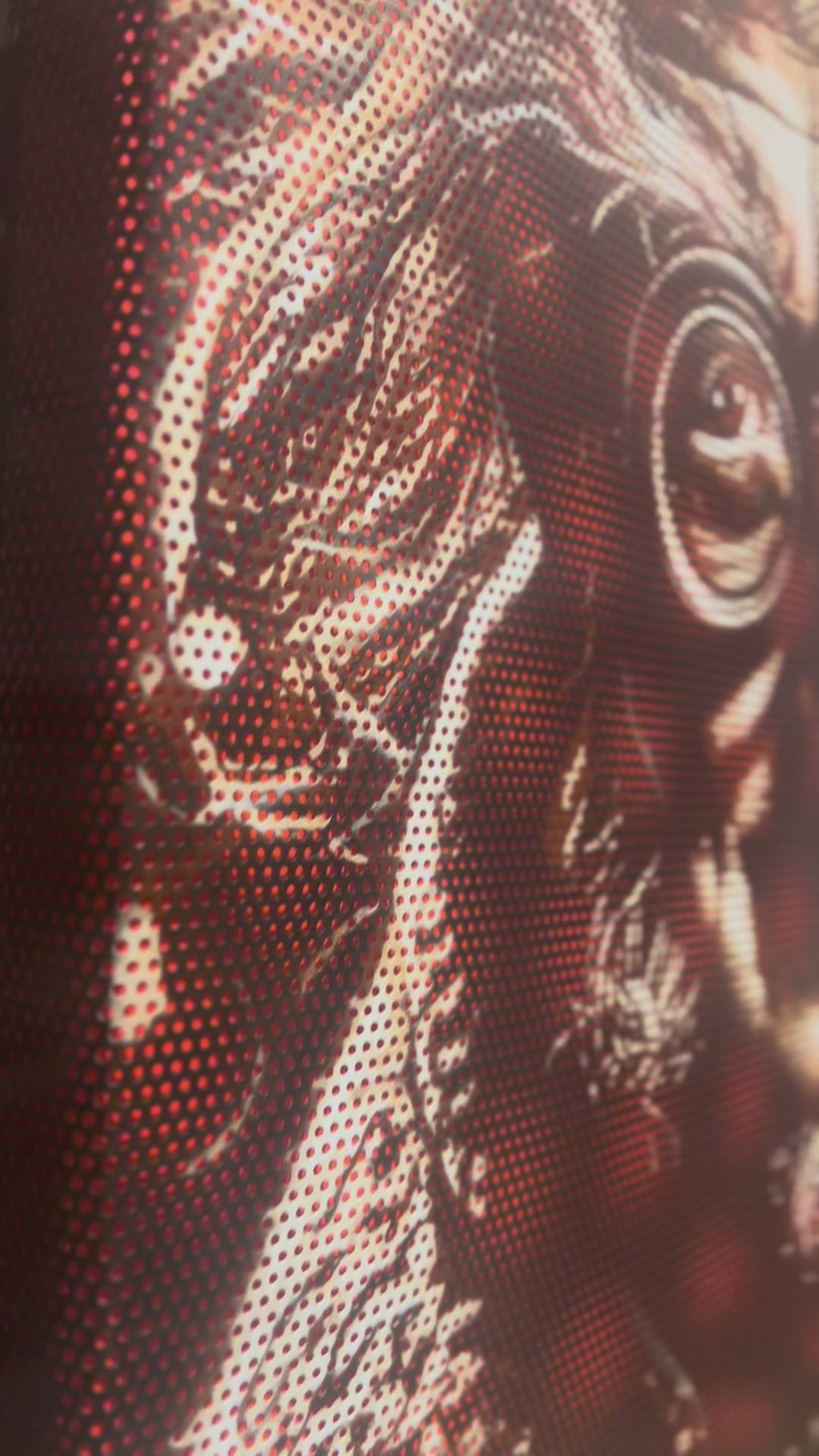 The holes in the steel represent pixels, the colours behind them blur and mix in the eye, not on the canvas. As the viewer shift their position, so too does the image - just like the line between the real and the virtual.