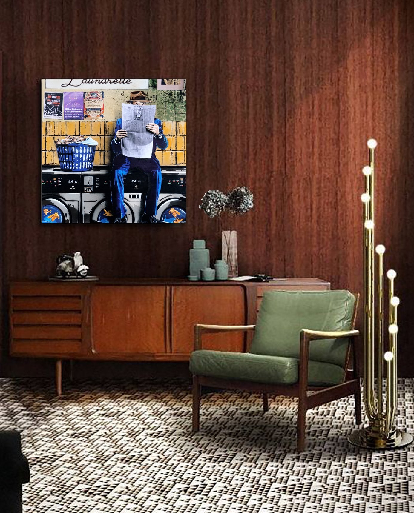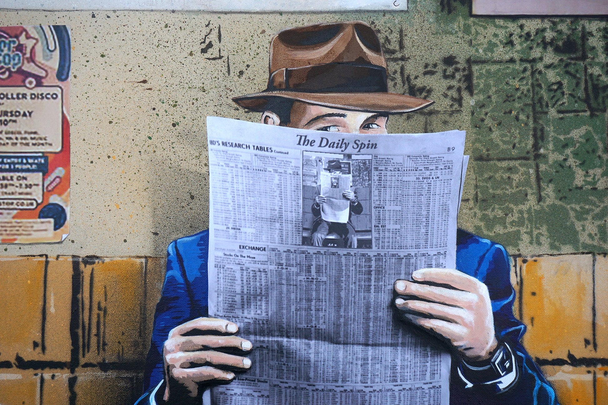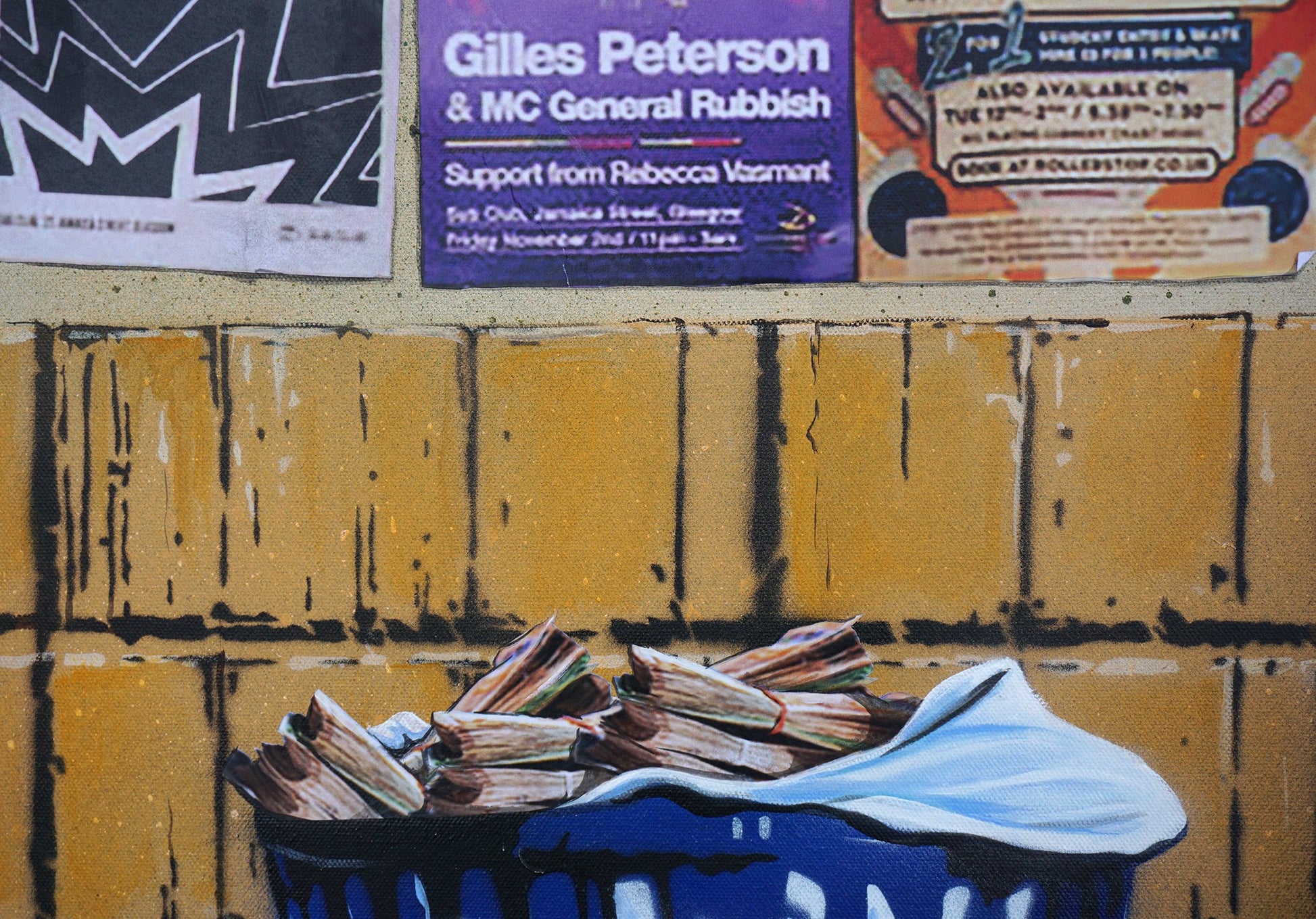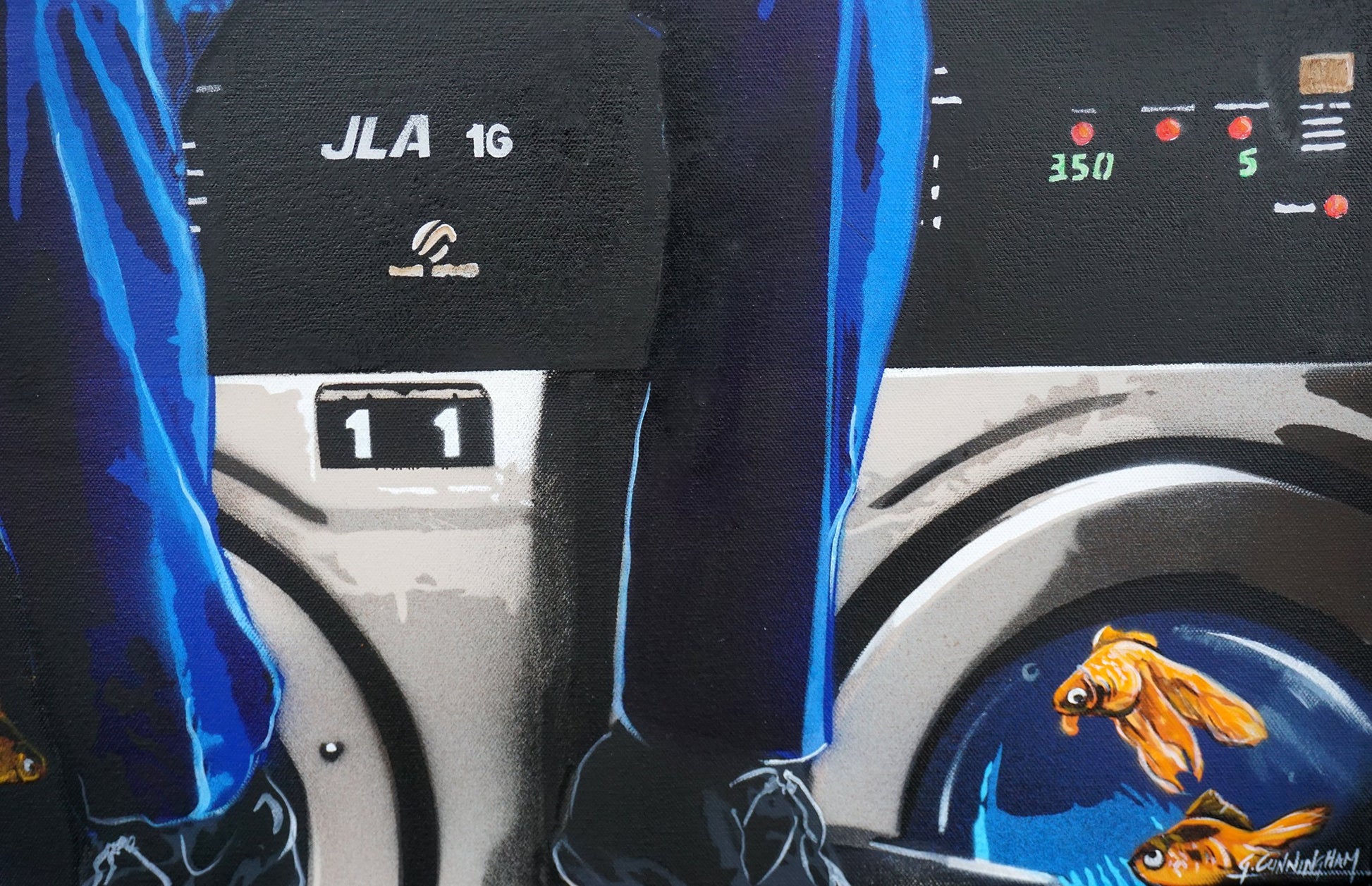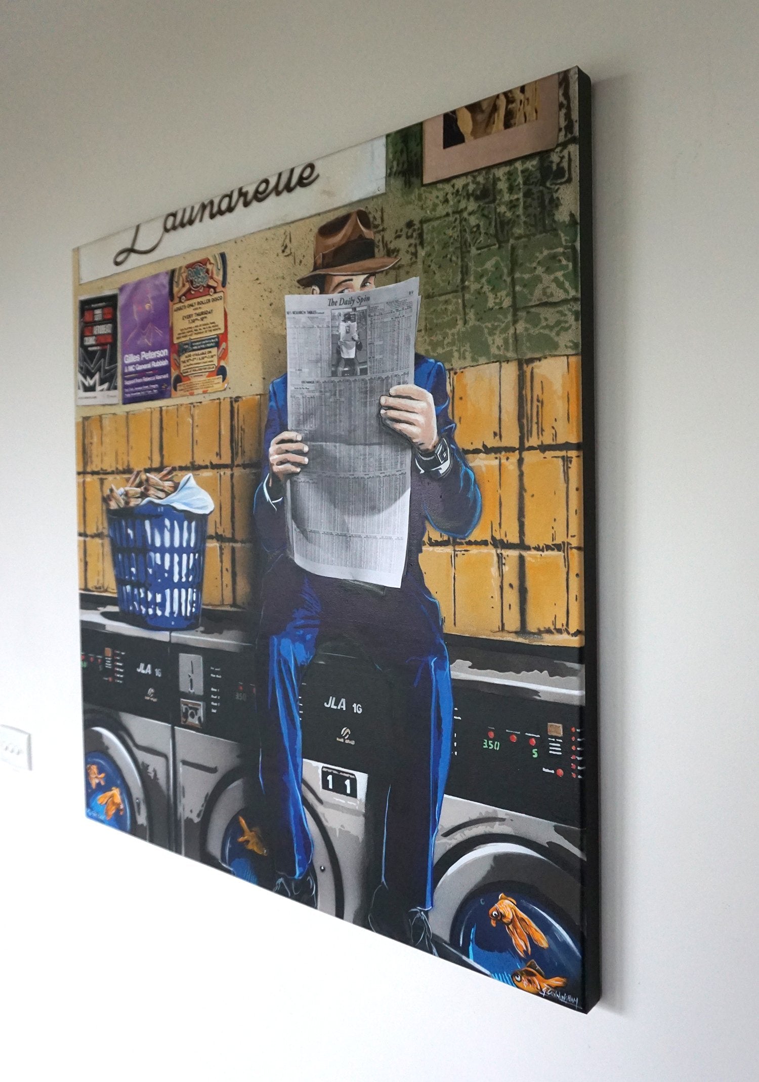"Faceless" men in suits continue to wield their power to influence the public, maintaining an outward appearance of propriety but with the aim of making as much money as they can, no matter the cost. On the surface, this painting appears to be a playful take on money laundering, but on closer inspection there is a lot more going on than first meets the eye.