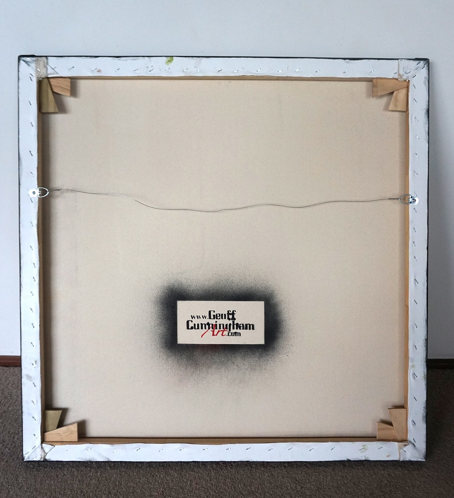 Aerosol, acrylic & collage on artist quality canvas 91.5x91.5cm. The edges are painted black and is ready to hang.