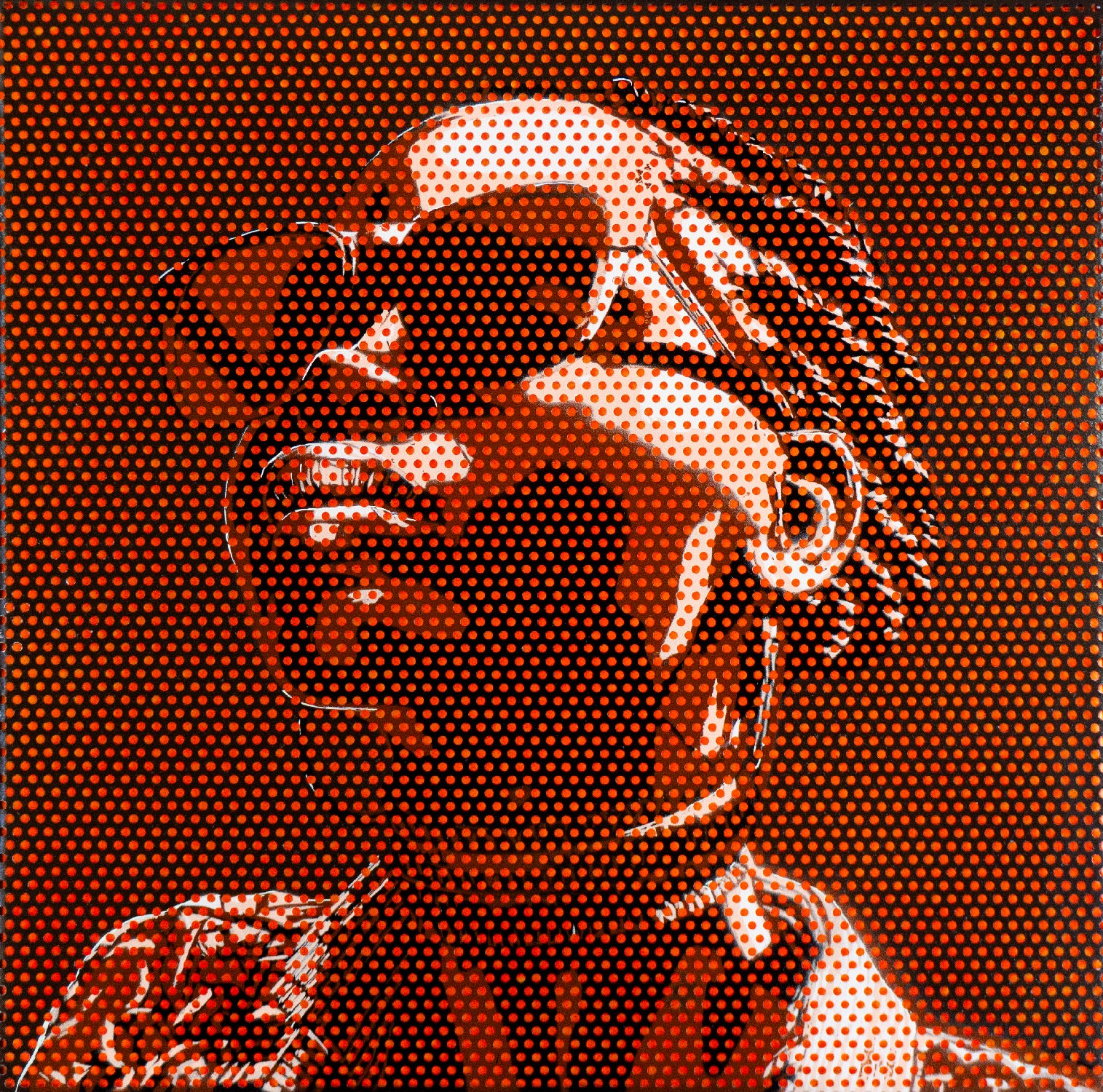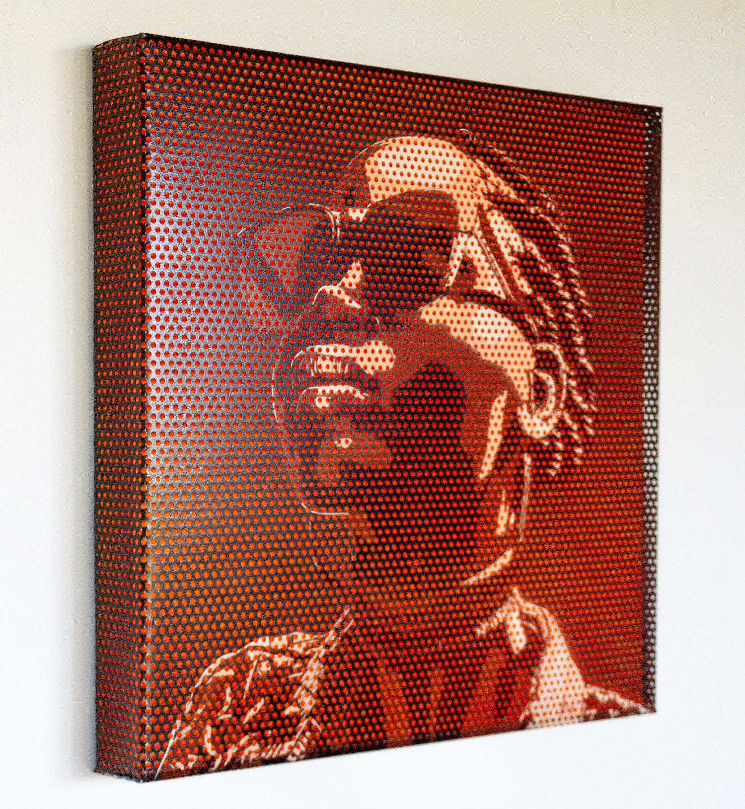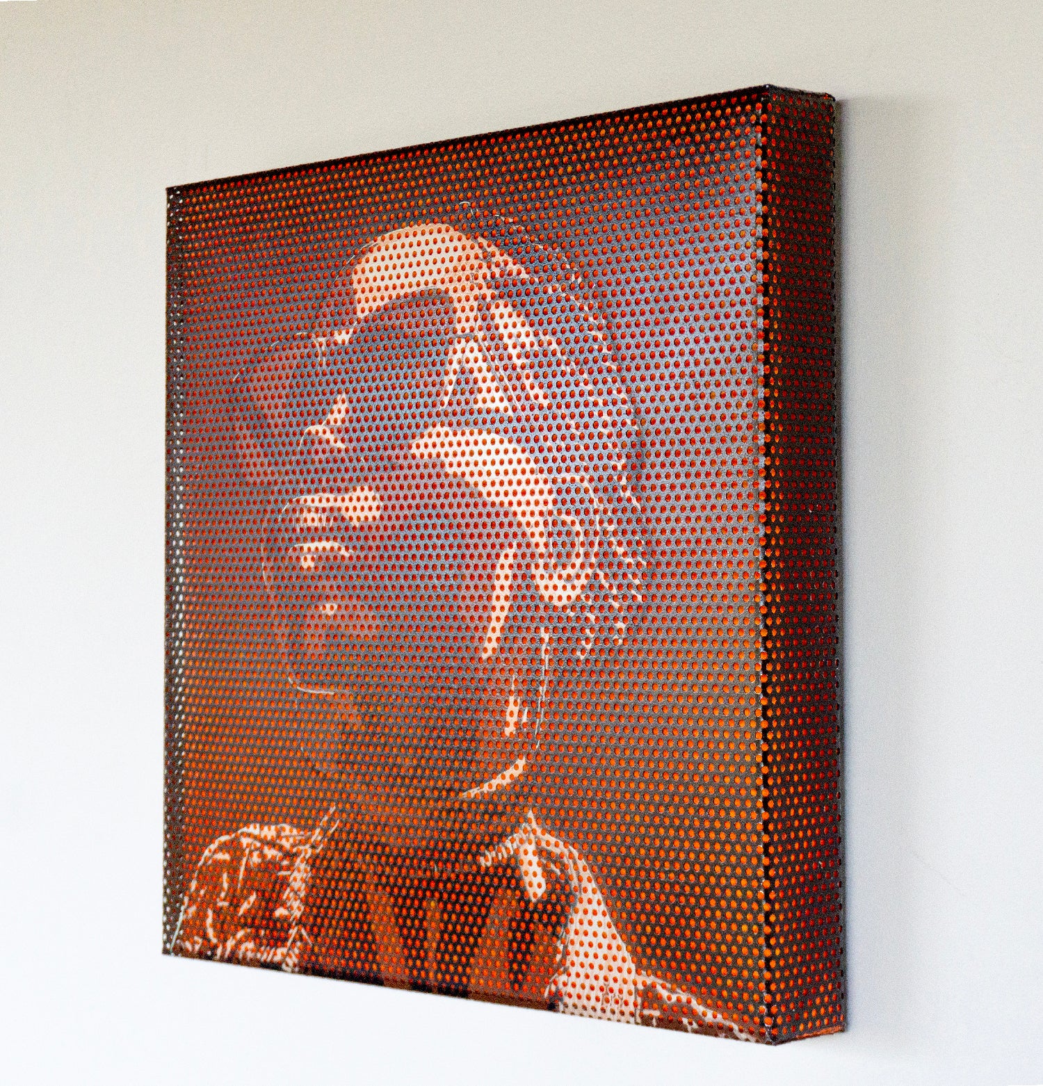 This new series uses my usual stencil technique, but this time the subjects are not inspired by memory or place - but are portraits created using AI - faces made from code. Using perforated steel as my "canvas", suspended over fluorescent backgrounds, each image plays with light and perception - asking: where does human identity end, and digital mimicry begin?