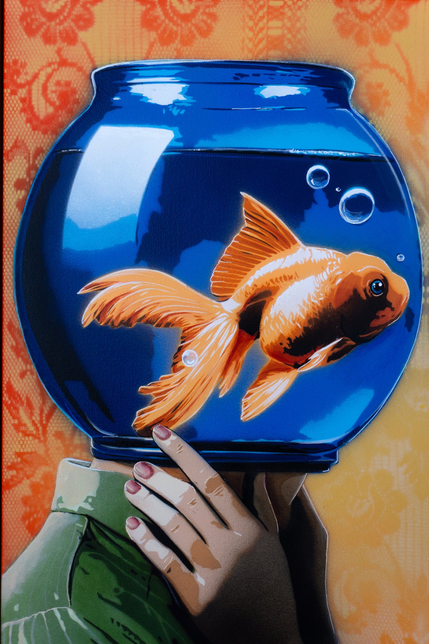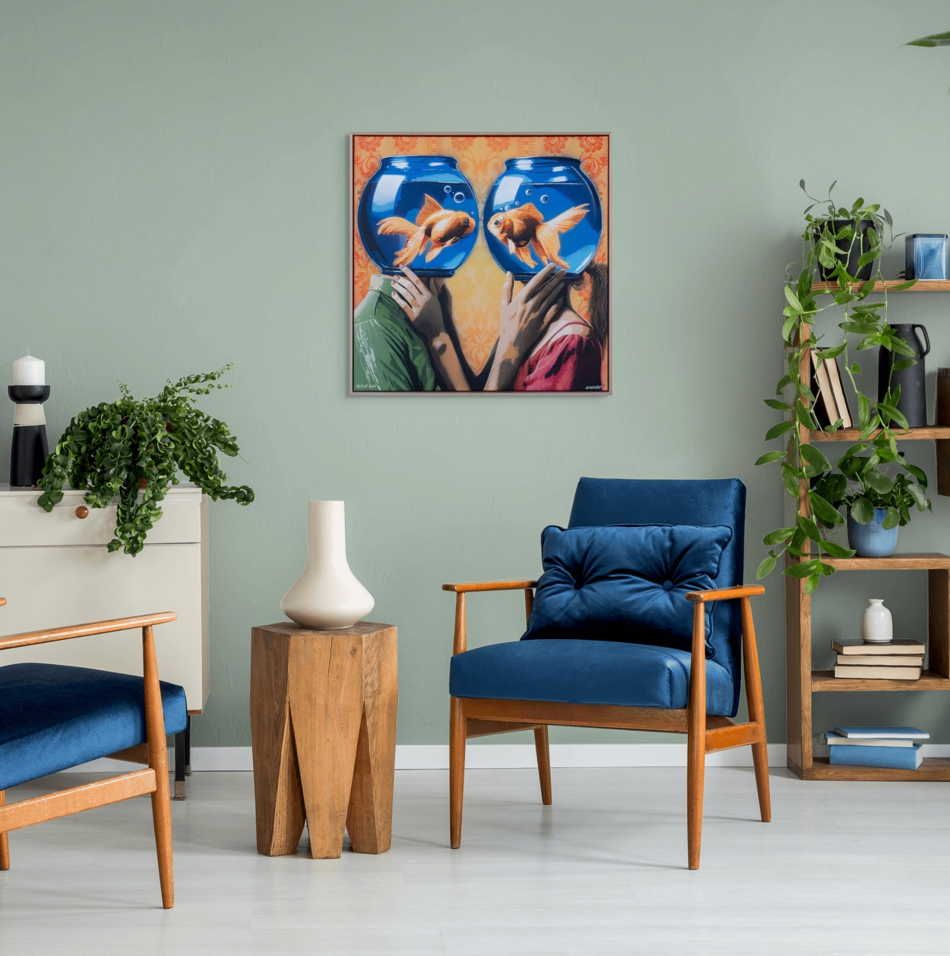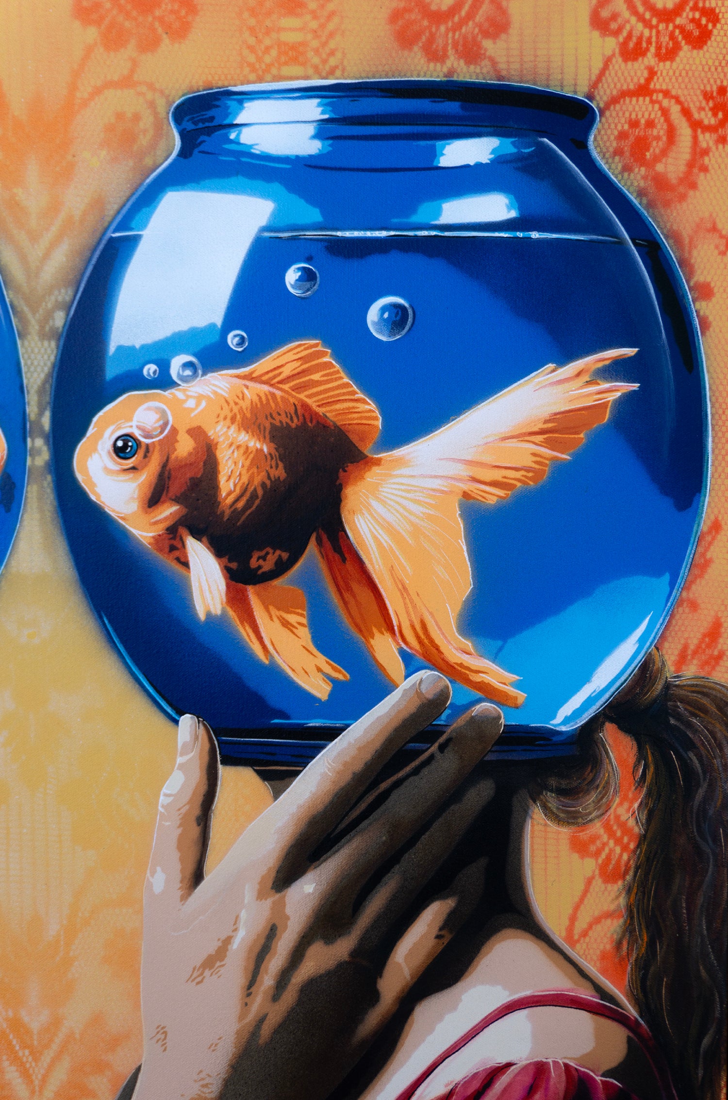 This painting offers a surreal exploration of identity and connection. Whilst the world has never been busier and more crowded, we can find ourselves becoming increasingly lonely and overwhelmed. The two figures gently cradle the bowls, emphasising both fragility and longing. The separation of the goldfish in their individual bowls speaks to themes of isolation and mindlessness, while their mutual gaze hints at the yearning for understanding and connection.