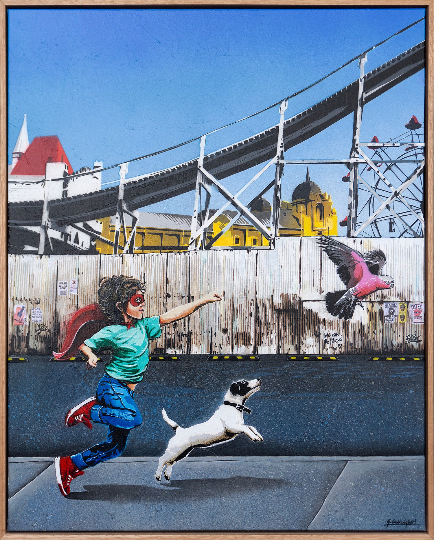 Acrylic & aerosol on canvas - 82 x 103 cm. Framed in natural oak. Free delivery Australia wide.