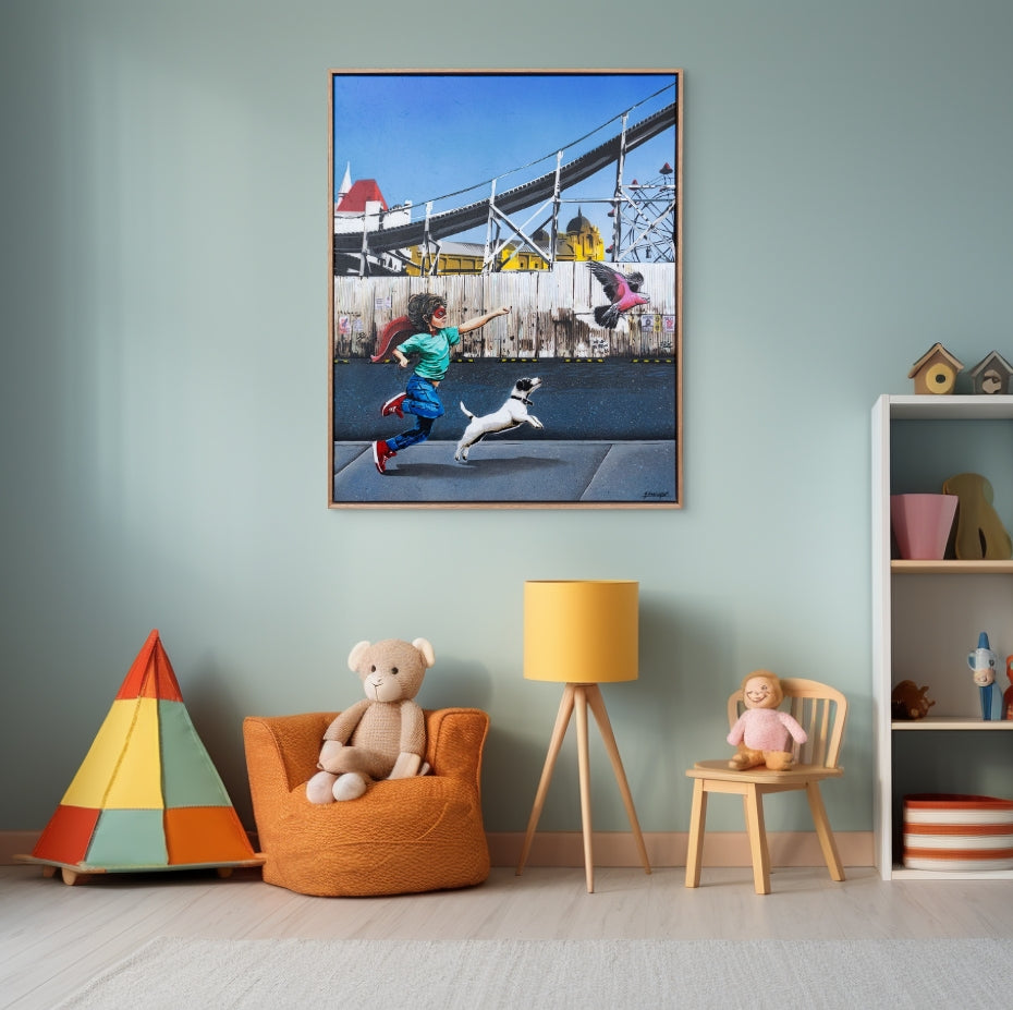 "This painting is all about imagination, playfulness and freedom. I love seeing kids dressed up as super heroes or fairies - even just to take a trip to the shops. It always makes me smile and think that it would be great if adults could live with that complete sense of freedom and lack of self-consciousness."