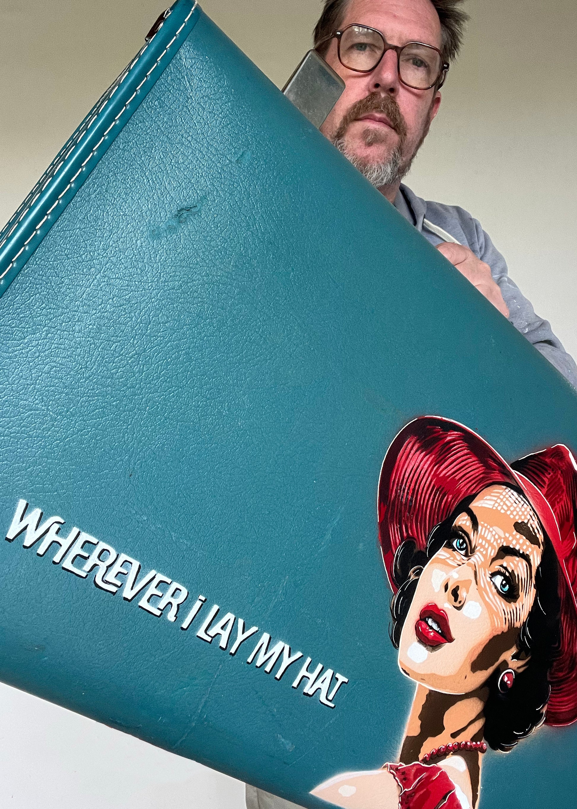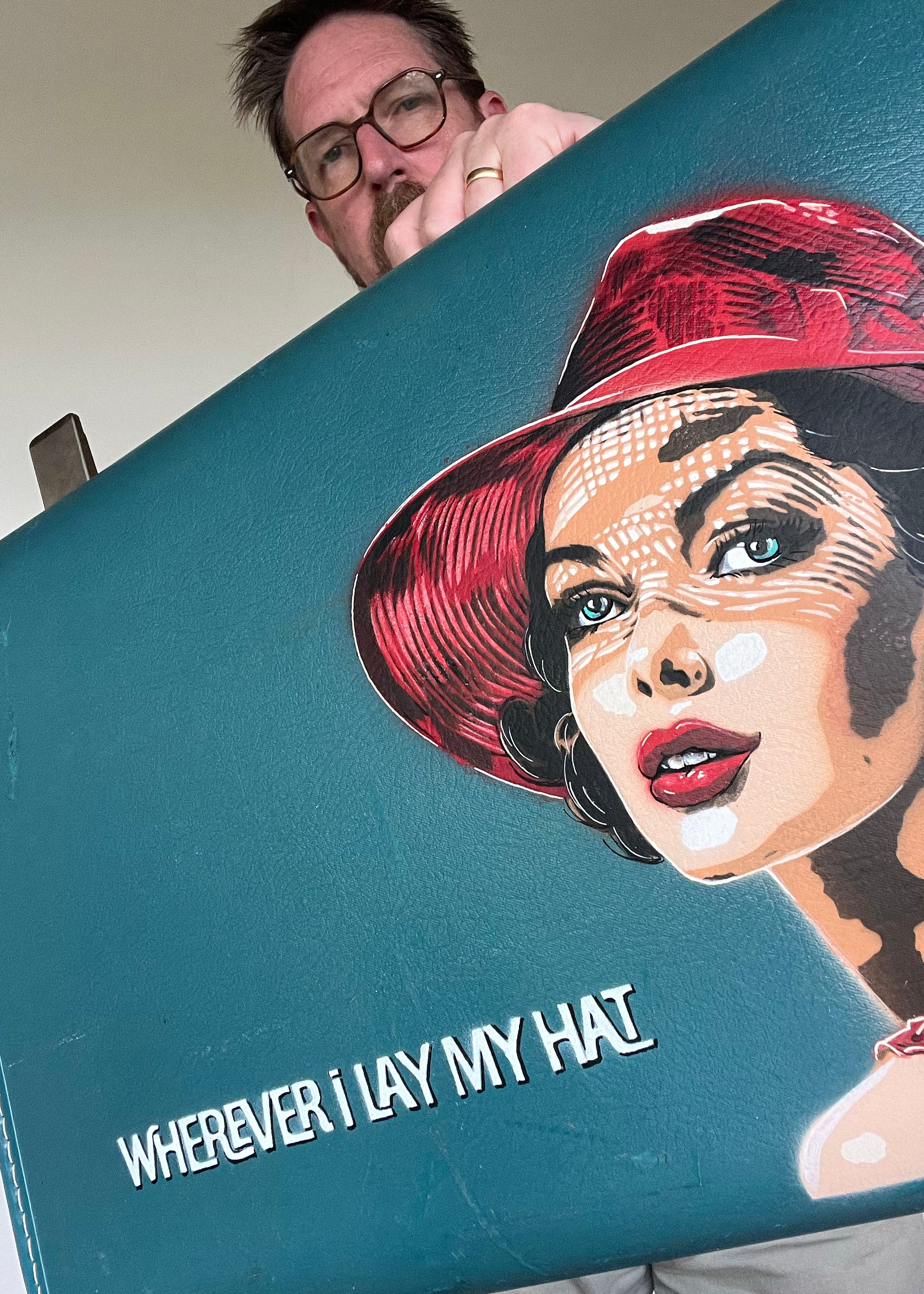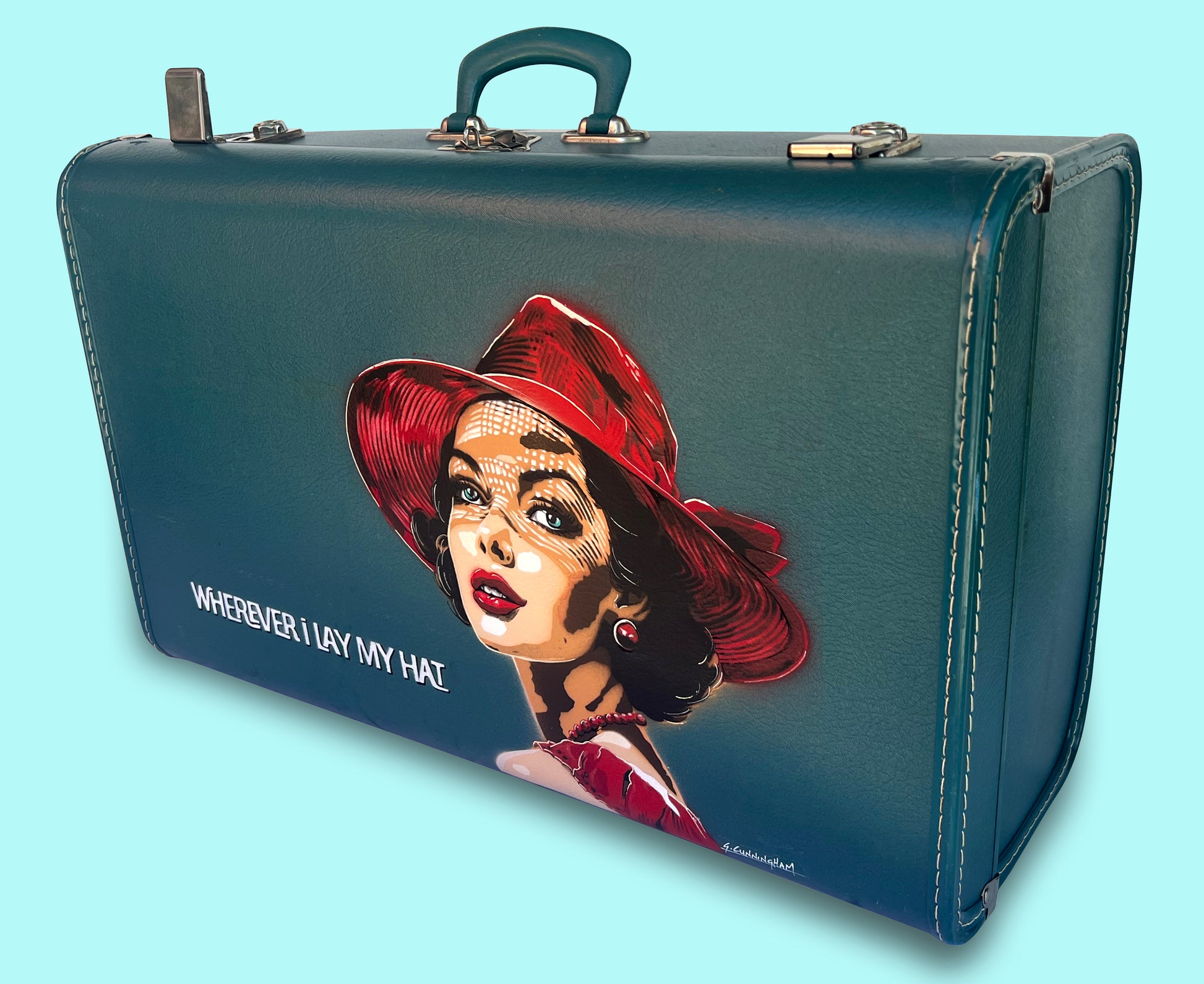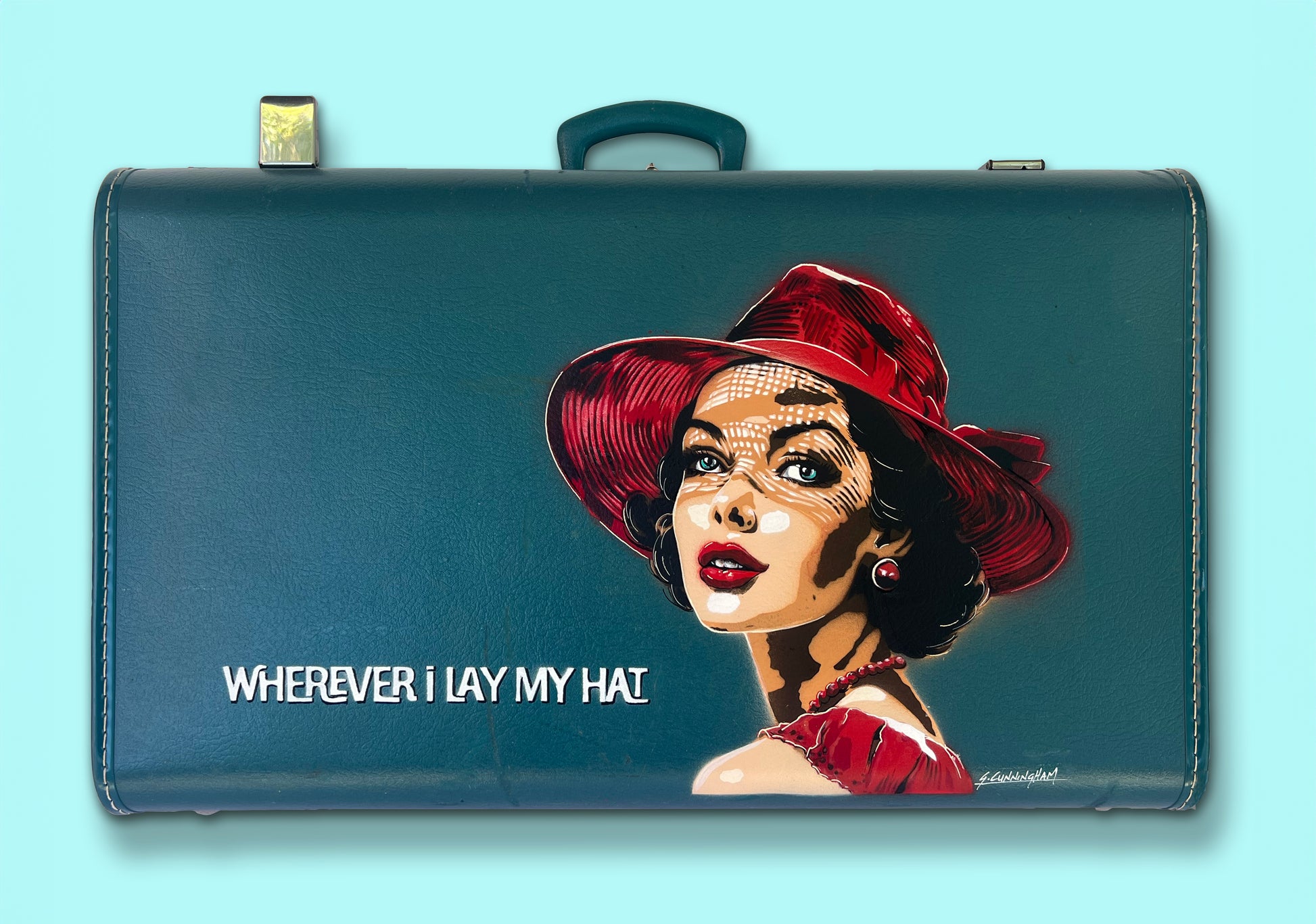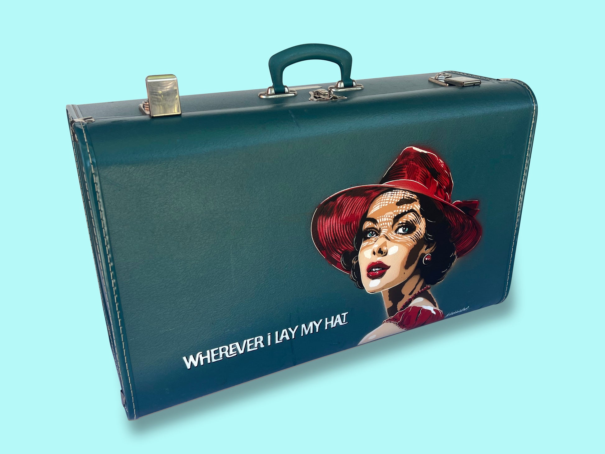 Acrylic & aerosol on a vintage suitcase. 60w x 38h x 22cm.