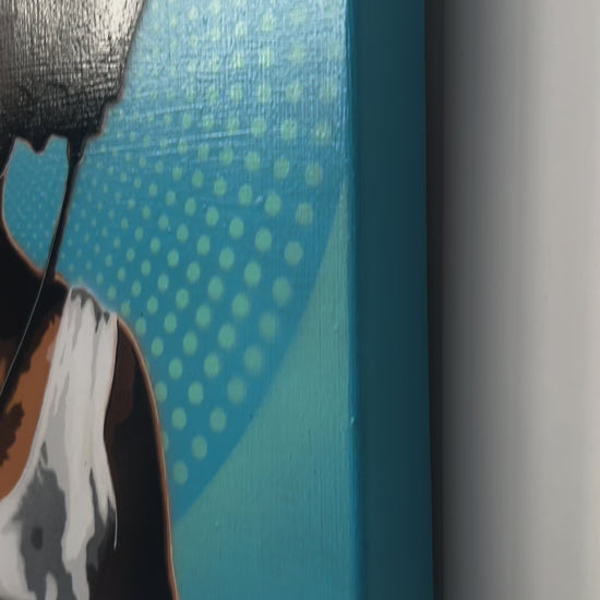 40 x 40cm, Acrylic & aerosol on canvas. The edges are painted blue and is ready to hang.