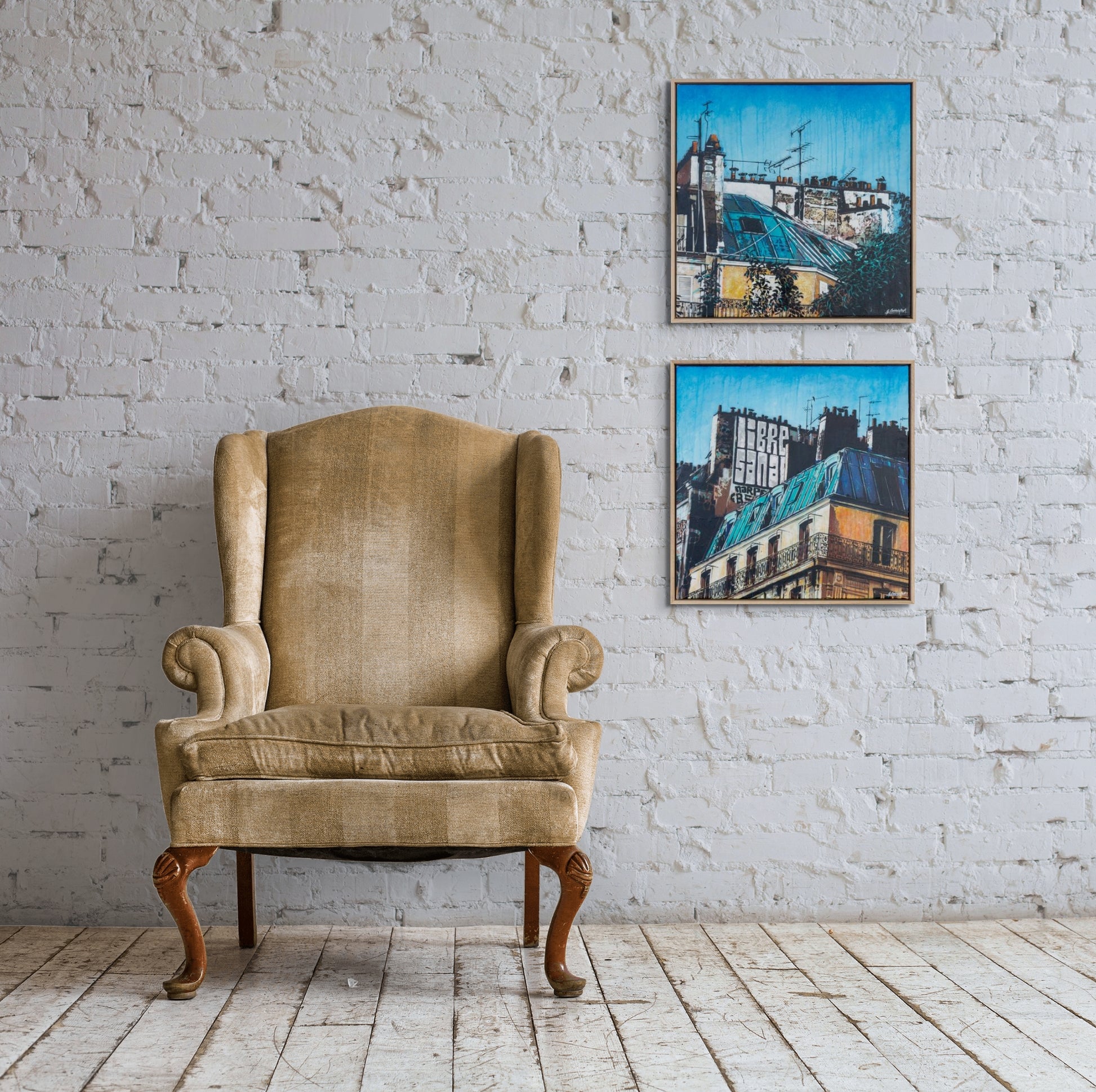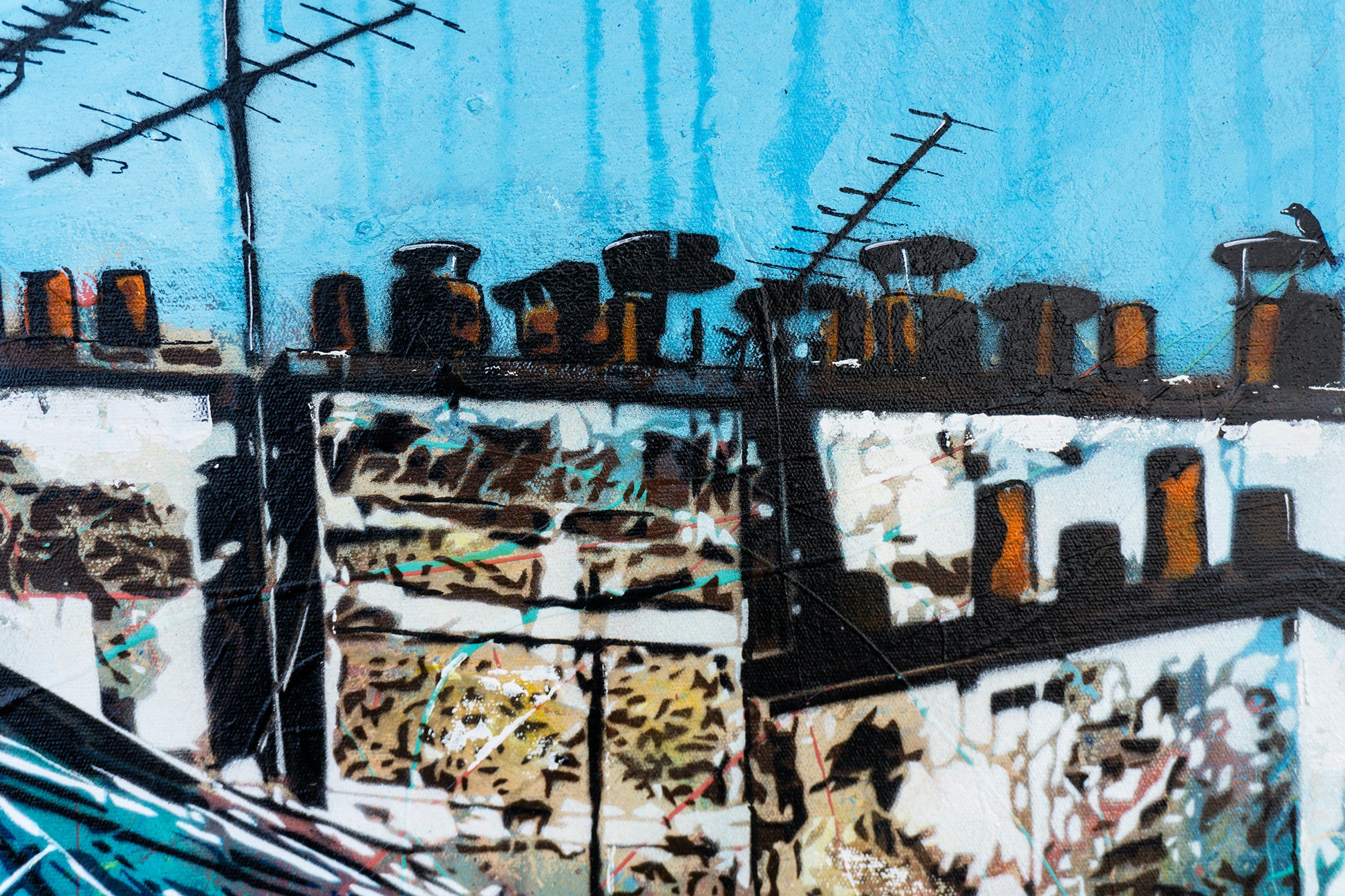 As an Australian travelling in Paris, the thought of living in these types of apartments is completely foreign to me. In this painting I am exploring the slightly less glamorous side of Paris and it's endless zinc roofs, hundreds of chimney stacks and TV aerials which I find fascinating.